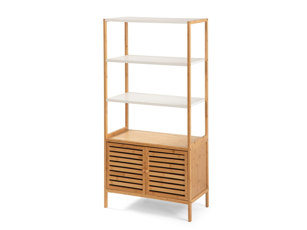 Praktická skříňka s otevřenými policemi a uzavíratelným úložným prostorem. Tři horní police vhodné pro vystavení nebo uložení potřebných věcí. Spodní část s dvířky s lamelovým designem, umožňující větrání uložených věcí. Kombinace bambusové konstrukce a bílých polic pro moderní vzhled. Stabilní a odolná konstrukce vhodná do koupelny, kuchyně či obývacího pokoje. Poskytuje dostatek úložného prostoru a zároveň působí elegantně.