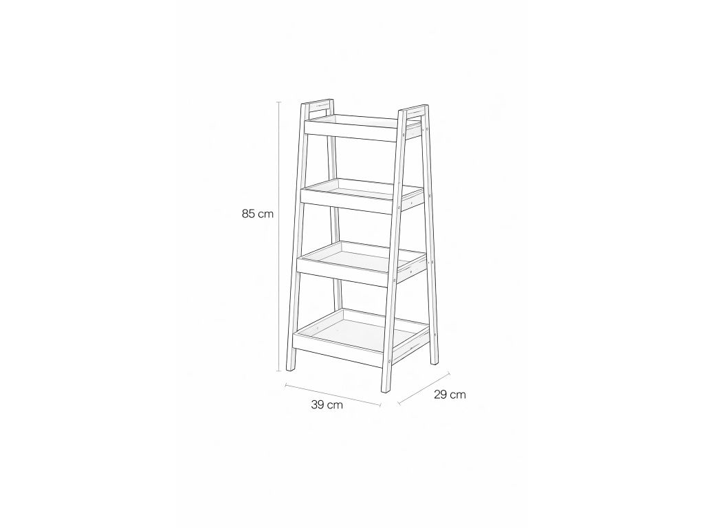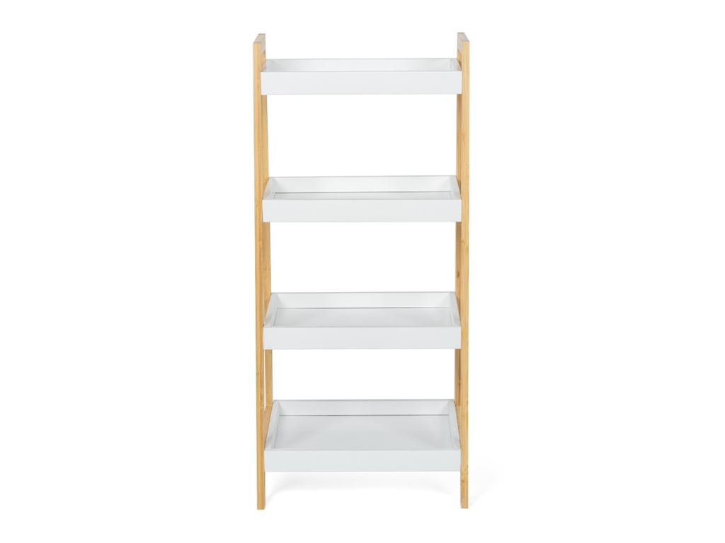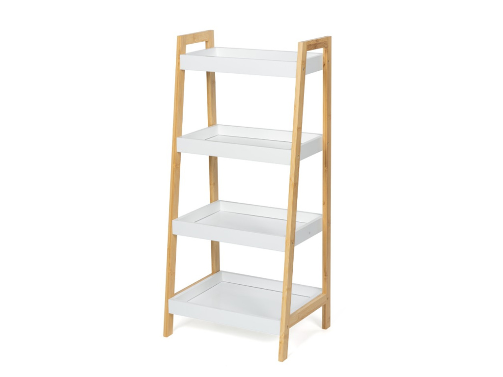 Designový policový díl se čtyřmi hlubšími policemi ve tvaru táců. Rám z přírodního bambusu dodává stabilitu a moderní vzhled. Bílé police s vyvýšenými okraji brání předmětům vypadnutí. Praktické řešení pro uložení dekorací, knih, ručníků nebo rostlin. Díky zkosené konstrukci působí odlehčeně a zapadne do moderních interiérů. Vhodný do obývacího pokoje, koupelny, ložnice i předsíně.