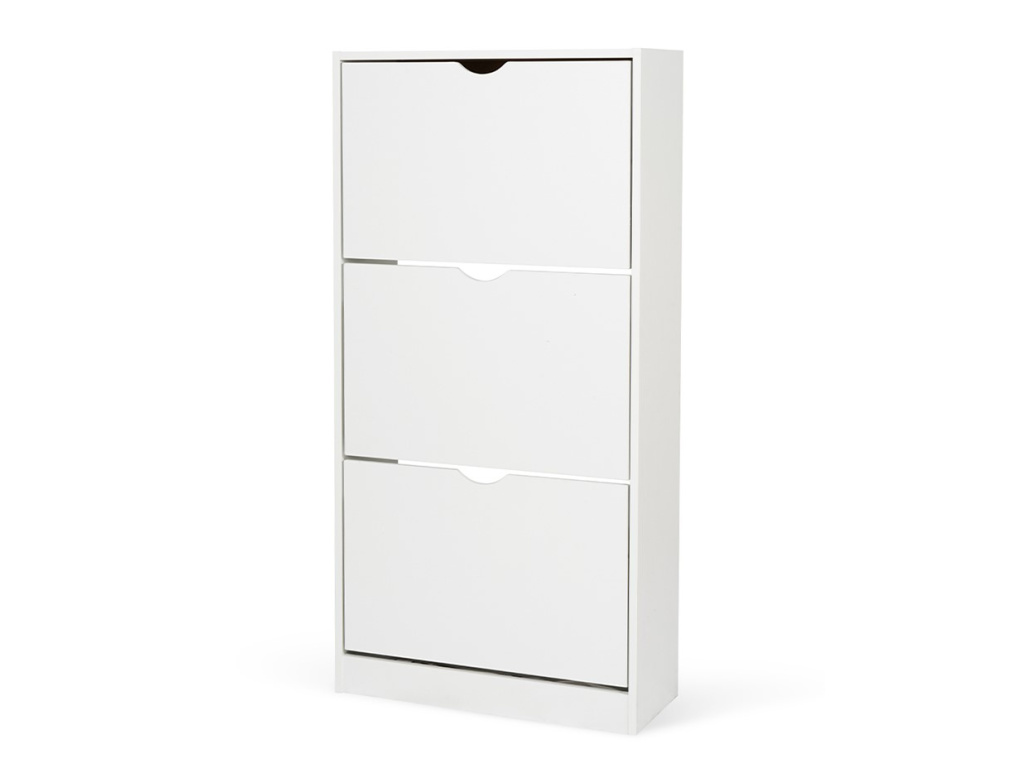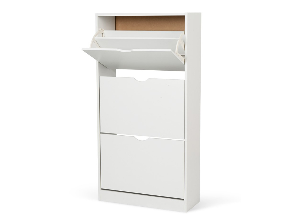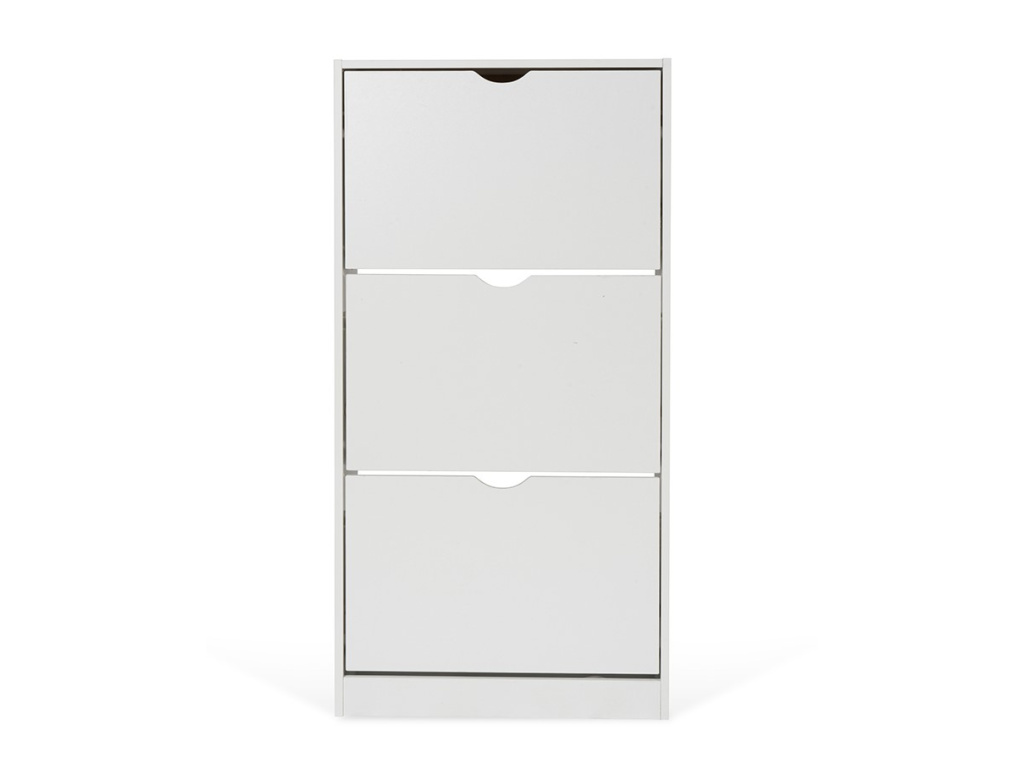 Botník z laminované dřevotřísky v bílé barvě, tři výklopné přihrádky, bez zadní desky.