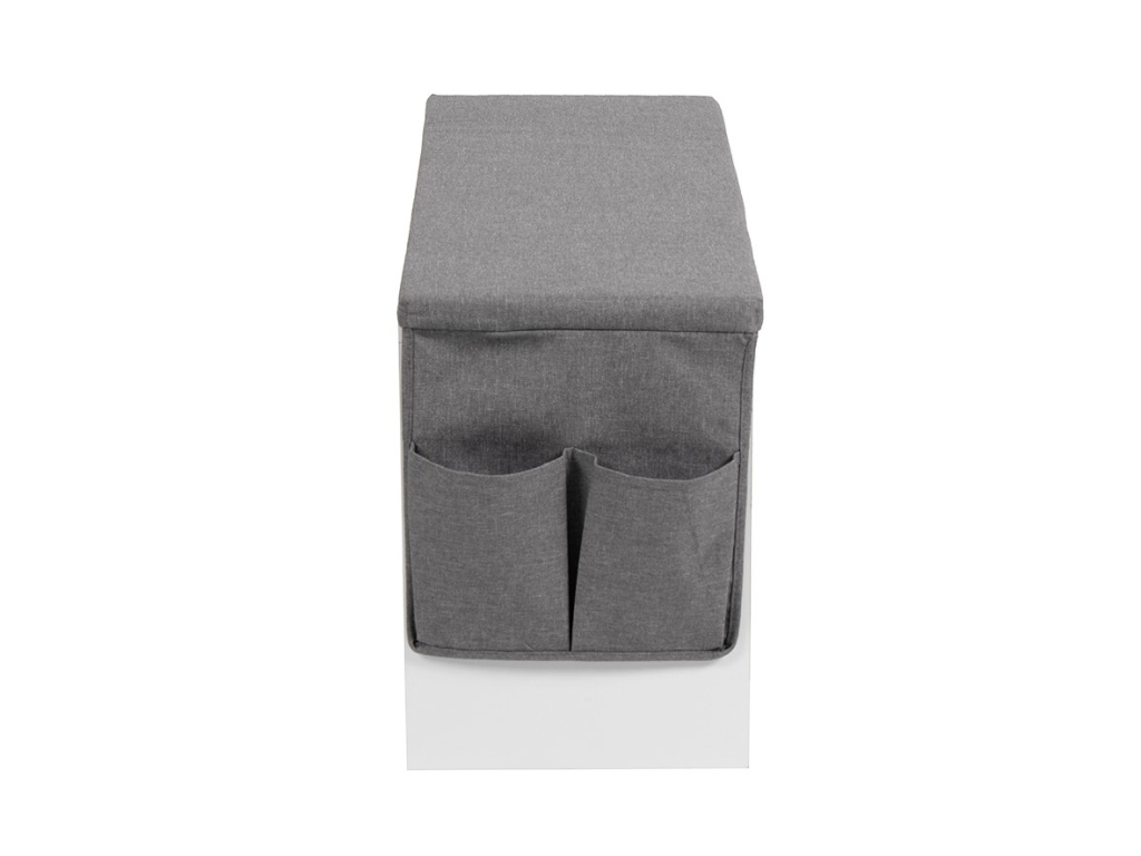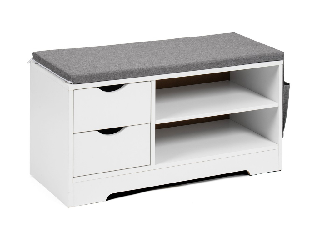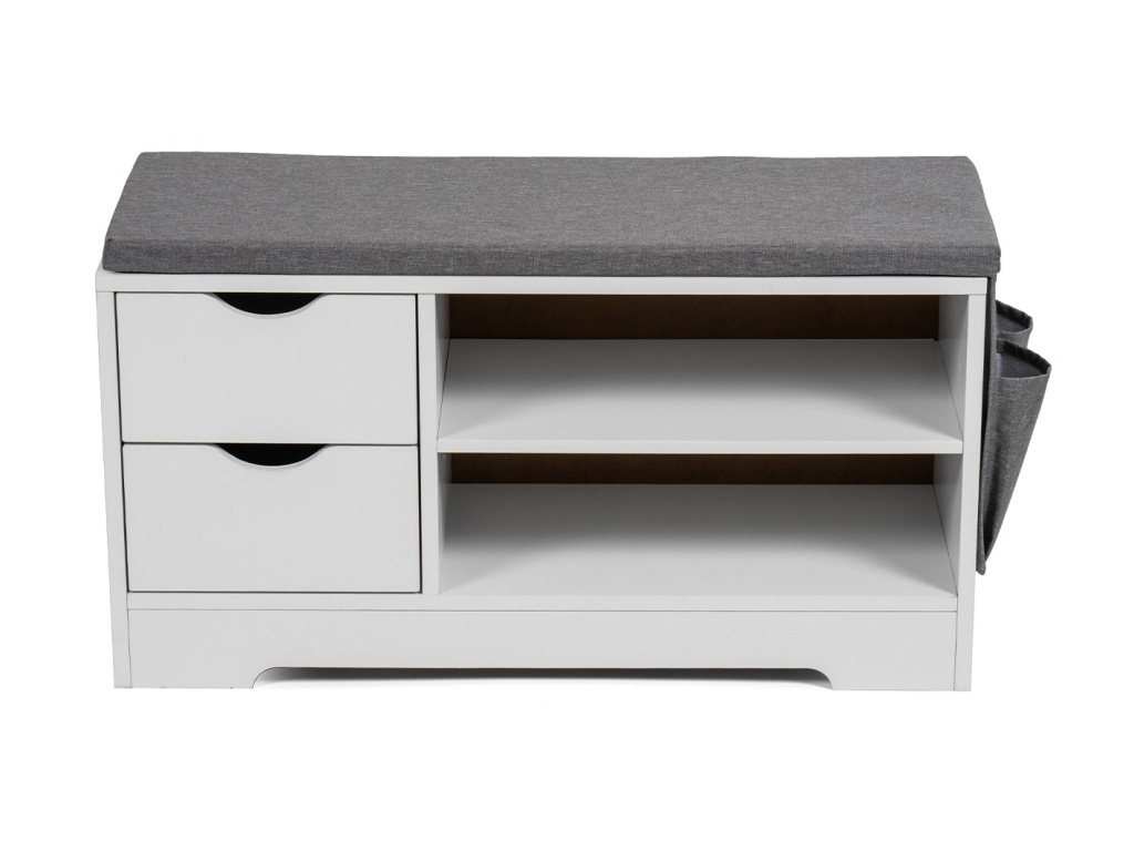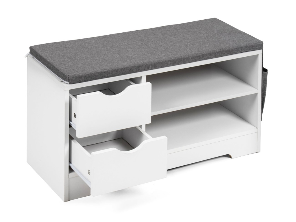 Botník s praktickým úložným prostorem a sedací plochou. Dvě zásuvky na drobnosti a dvě otevřené police na obuv. Měkký polstrovaný sedák pro pohodlné obouvání. Boční textilní kapsa pro další úložné možnosti. Funkční a elegantní doplněk do předsíně.