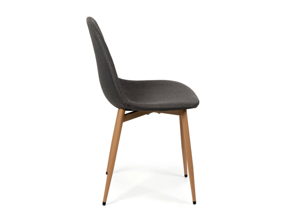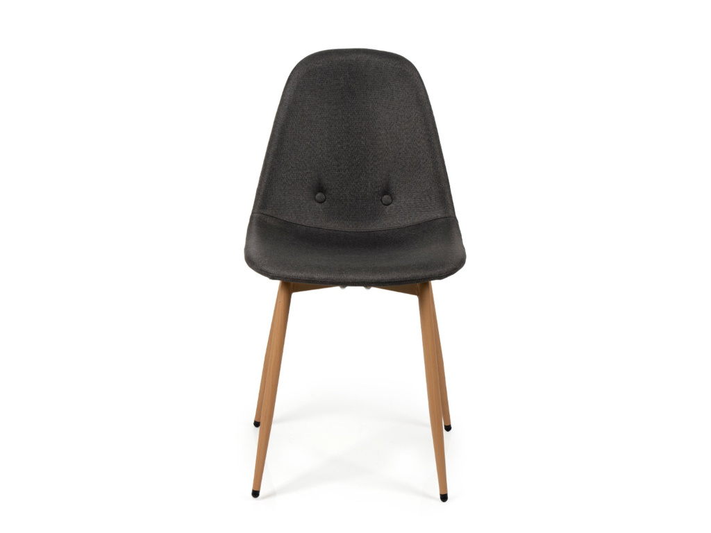 Modern chair with an elegant design. Comfortable upholstery in dark grey with decorative buttons. Stable legs in wood decor for a natural look. Suitable for the dining room, kitchen, or study. A combination of comfort, simplicity, and stylish design.