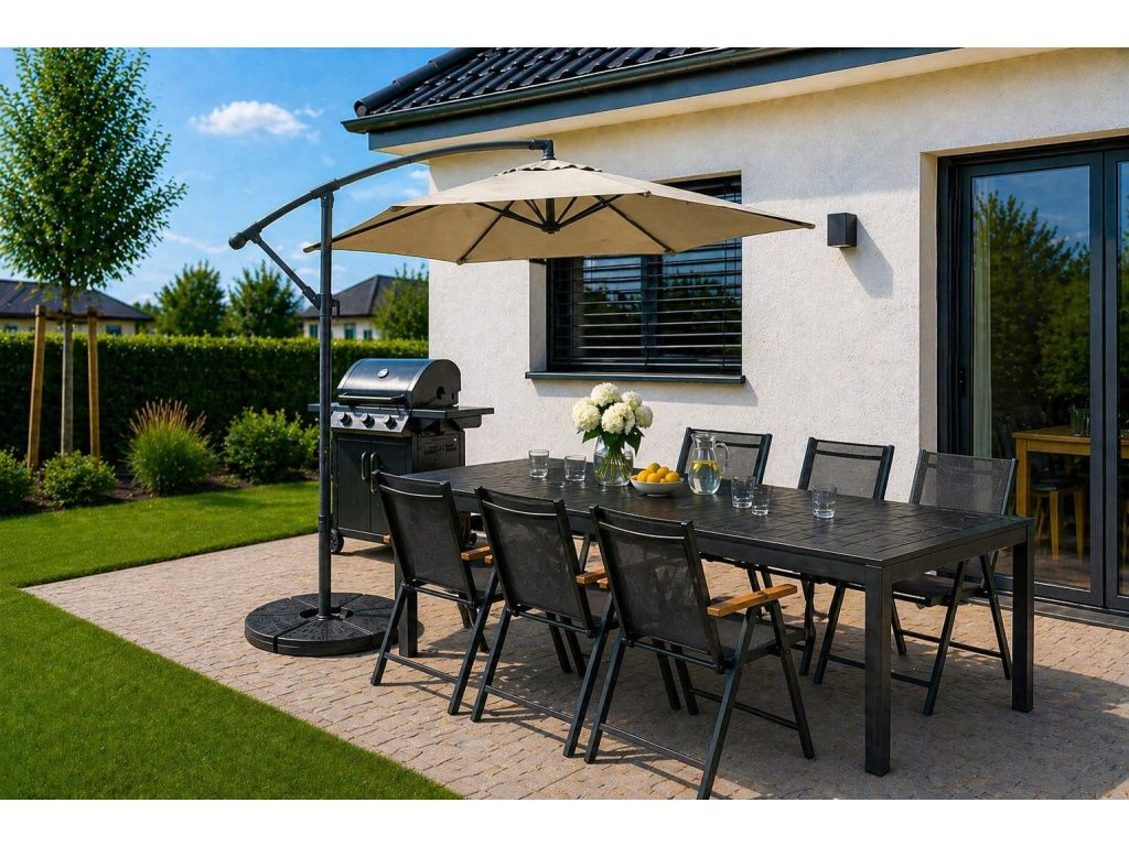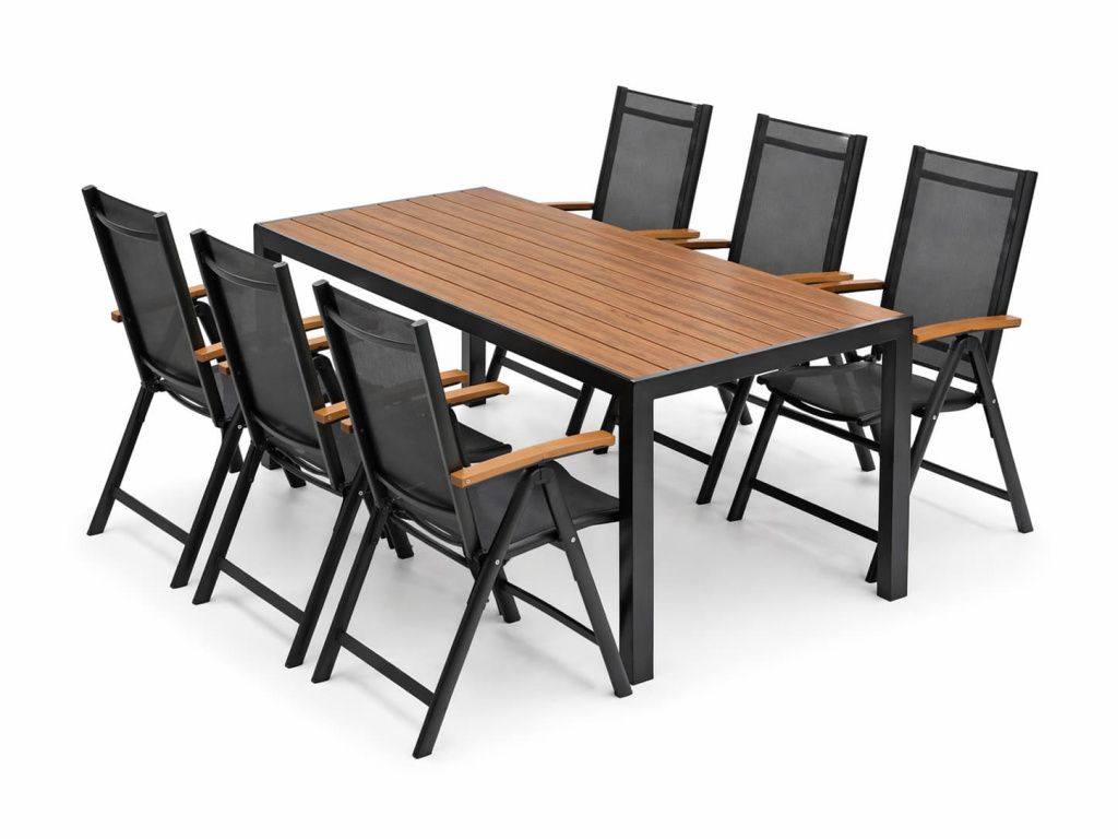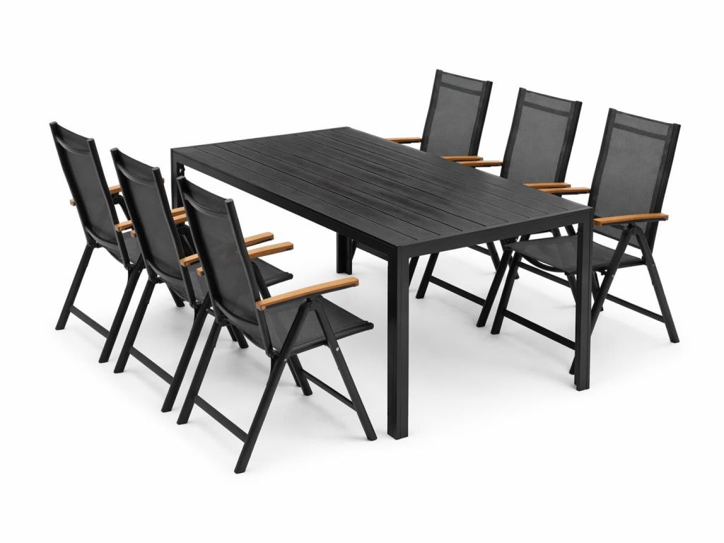 Folding Reclining Garden Chair – Aluminium frame with natural artwood armrests, black 4×4 textilene.