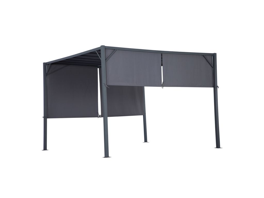 Pergola se stahovatelnými postranními polyesterovými plachtami v tmavě šedé barvě, ocelová konstrukce v černé barvě.