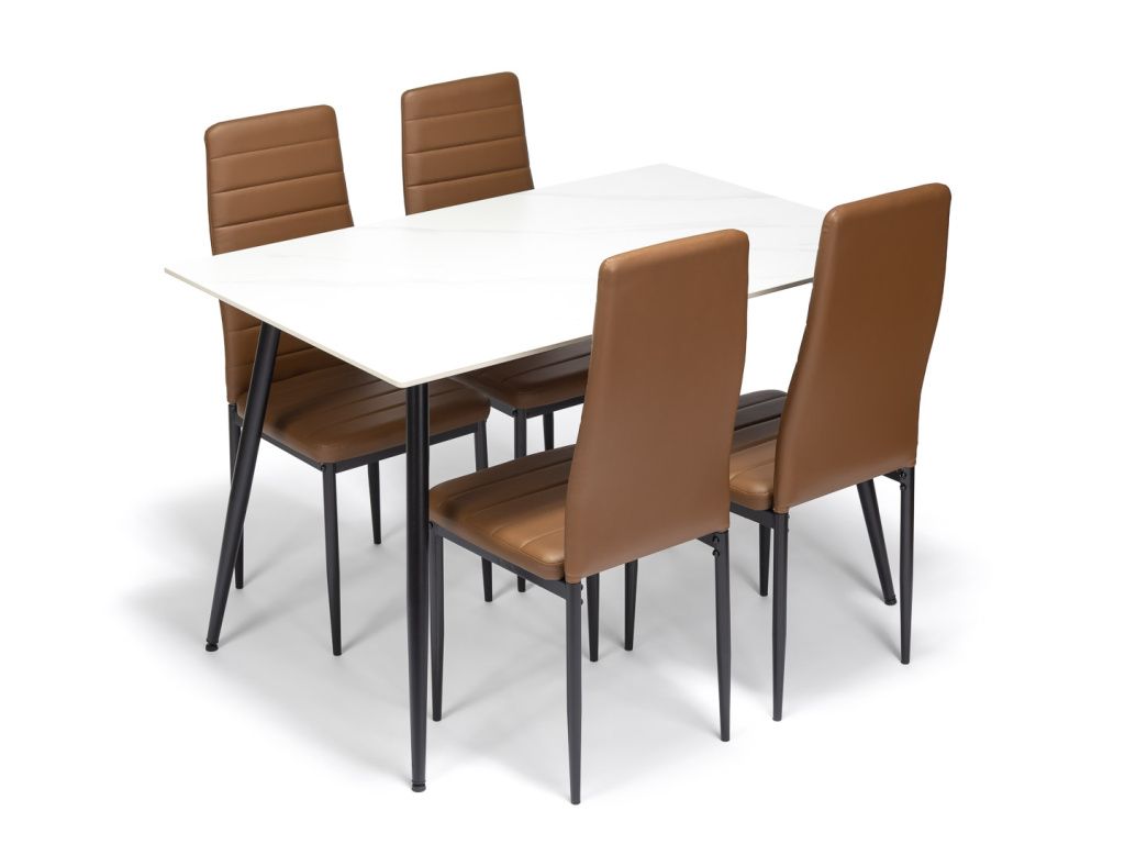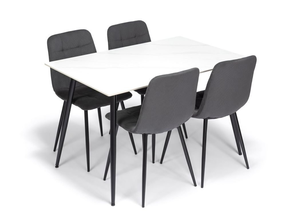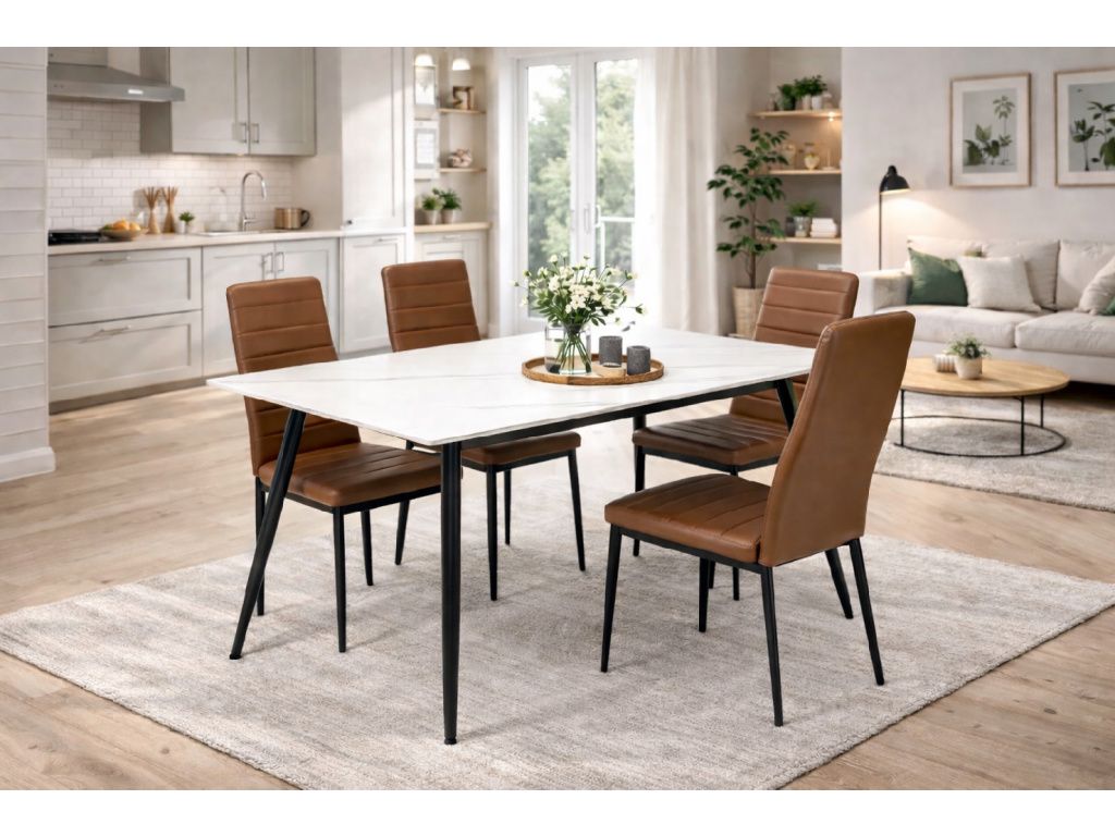 Elegantní jídelní stůl s keramickou deskou v dekoru bílého mramoru přináší do interiéru svěží a nadčasový design. Jemná mramorová kresba na světlé desce působí luxusně, ale zároveň přirozeně, takže stůl snadno zapadne jak do moderních, tak do klasicky laděných interiérů. Minimalistické kovové nohy v černém provedení dodávají stolu stabilitu a zároveň vytvářejí stylový kontrast, který zvýrazňuje celkový design.
