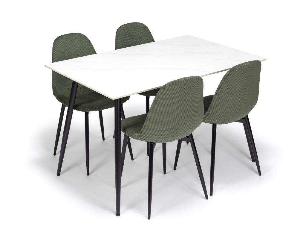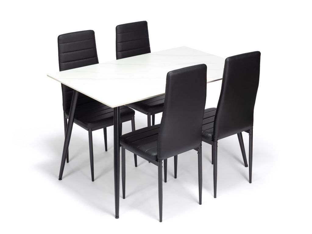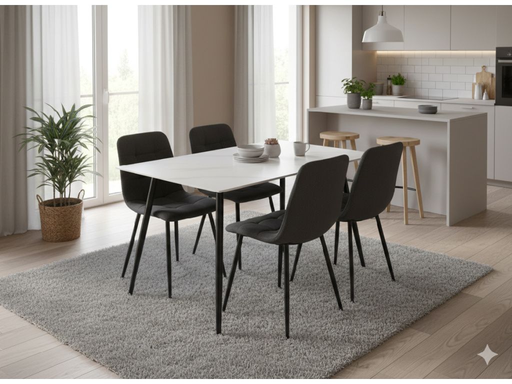 Moderní jídelní stůl s keramickou deskou v dekoru bílého mramoru působí elegantně, lehce a nadčasově. Kombinace světlé desky s jemnou kresbou mramoru a černých kovových nohou vytváří stylový kontrast, který skvěle zapadne do moderních i minimalistických interiérů. Keramická deska je navíc velmi odolná proti poškrábání, teplu i každodennímu používání.
