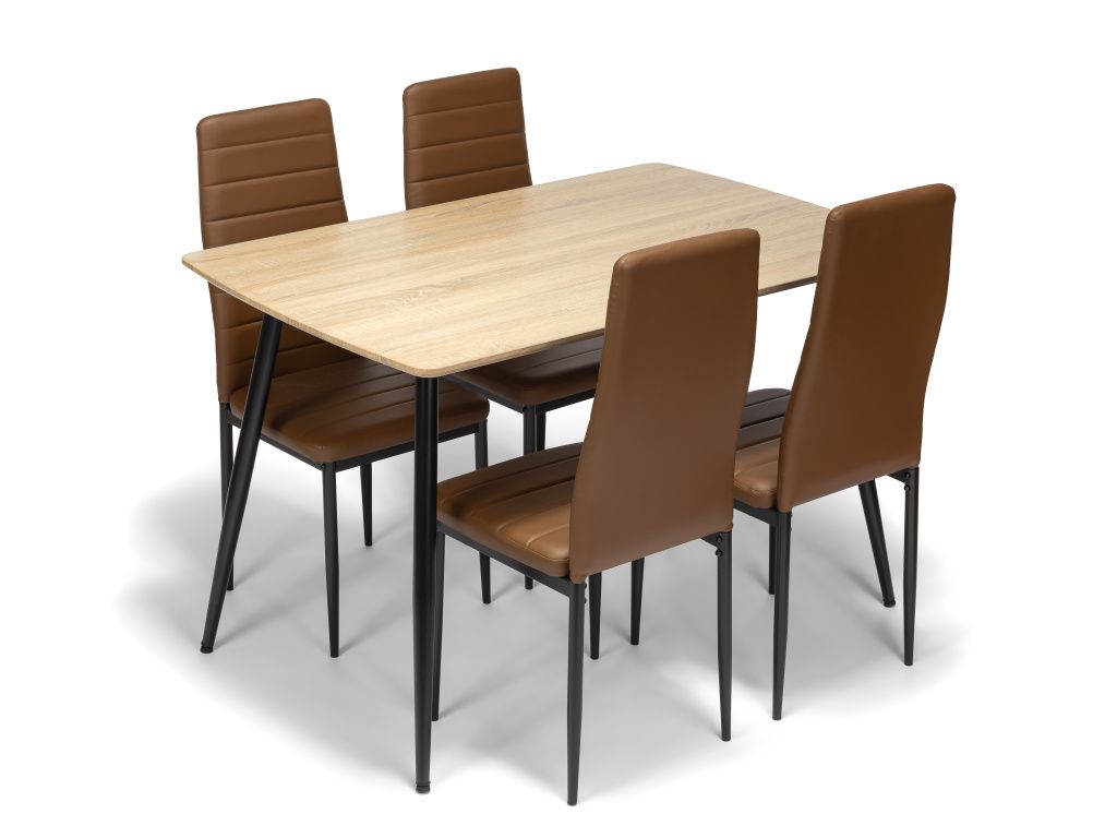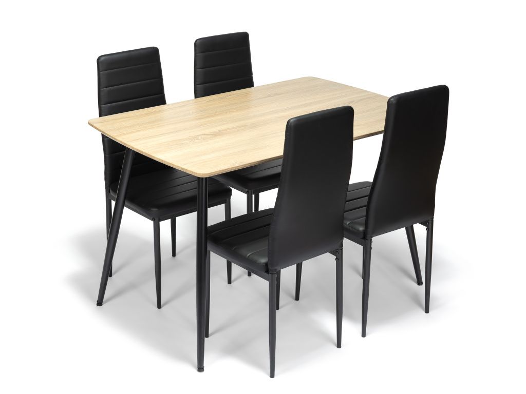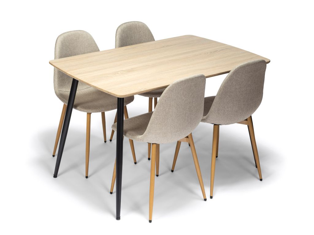 Stylový jídelní stůl s deskou v dekoru přírodního dřeva přináší do interiéru teplo a přirozenou eleganci. Černé kovové nohy dodávají stolu moderní kontrast a zajišťují pevnou stabilitu. Ideální volba pro moderní i skandinávsky laděné jídelny.