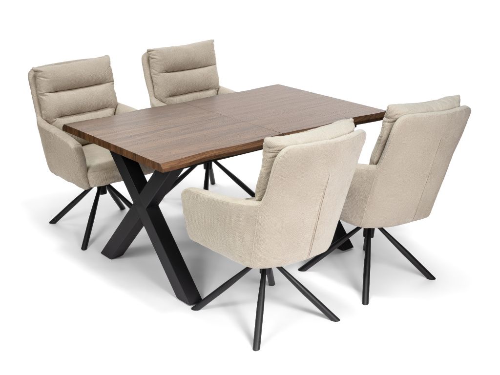Moderní jídelní set, který kombinuje elegantní dřevěnou desku s výraznou kovovou podnoží a pohodlnými čalouněnými židlemi. Ideální volba pro stylový a komfortní interiér, kde se design snoubí s každodenní praktičností, jelikož se dá navíc rozkládat, až na 185 cm.
