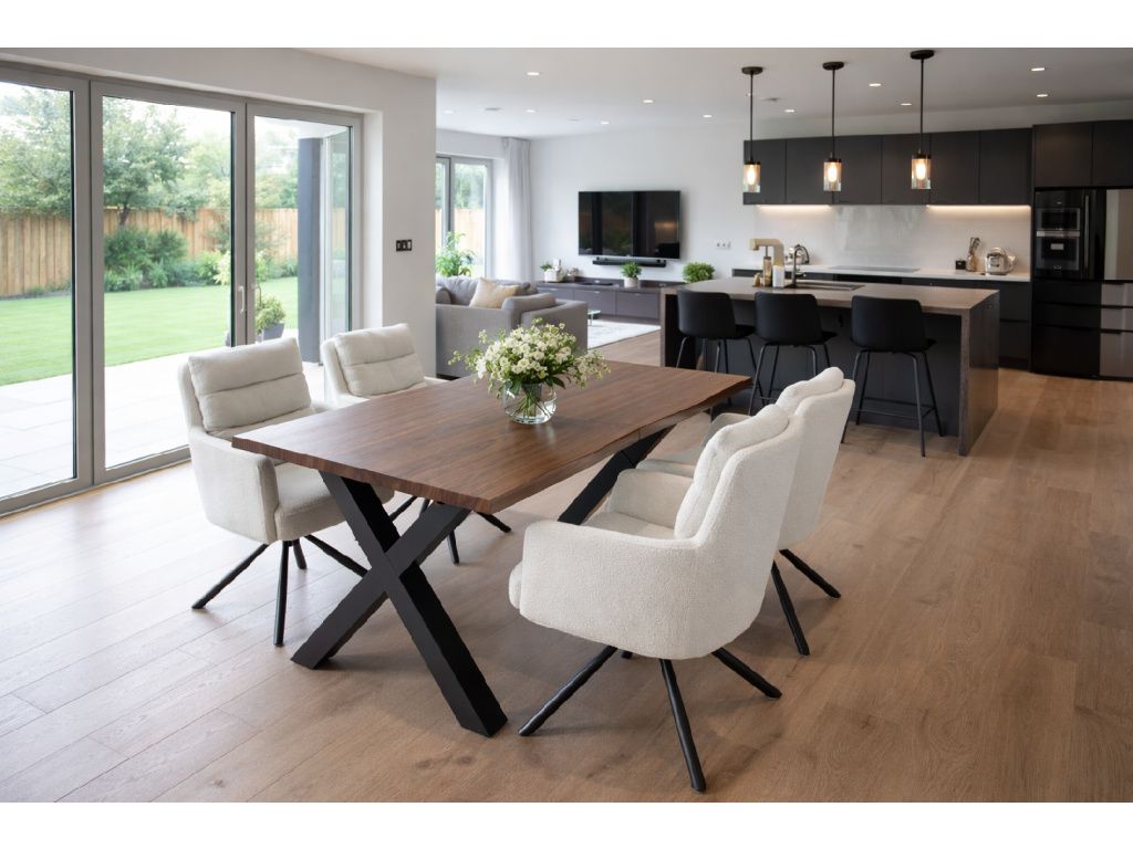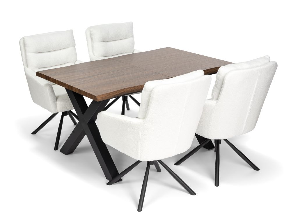 Moderní jídelní set v kombinaci teplého dekoru dřeva a elegantního čalounění, který vnese do vašeho domova útulnost i styl.
