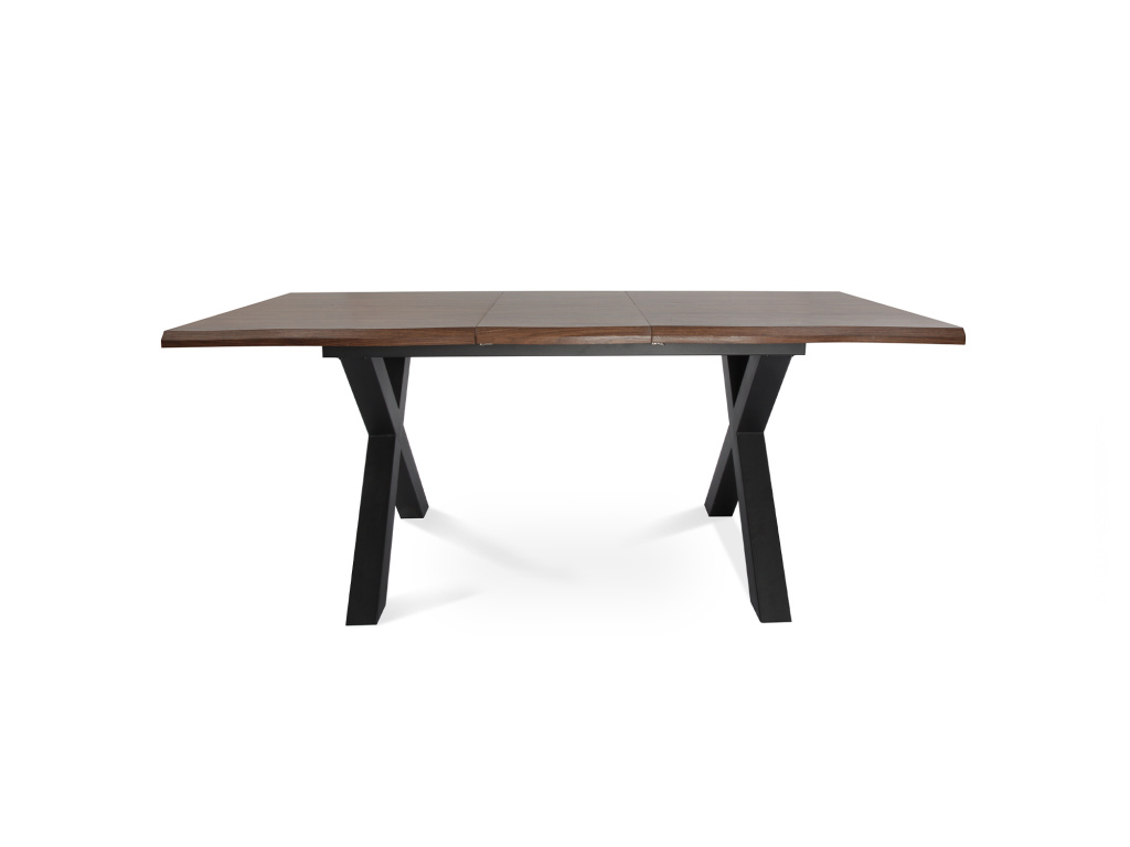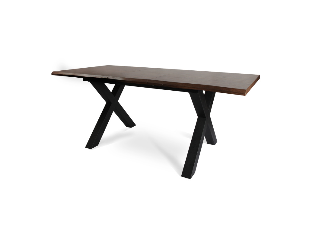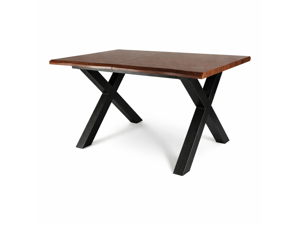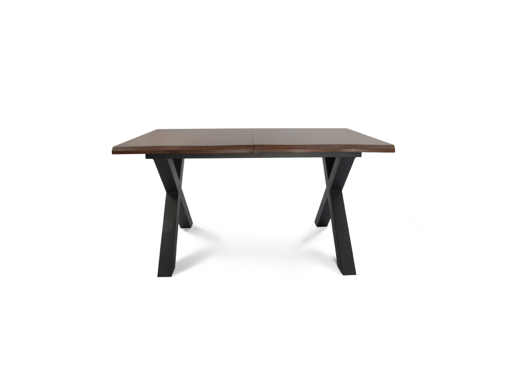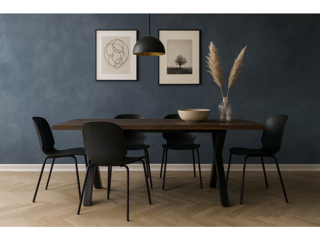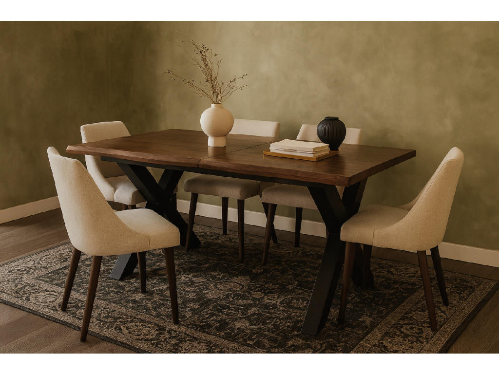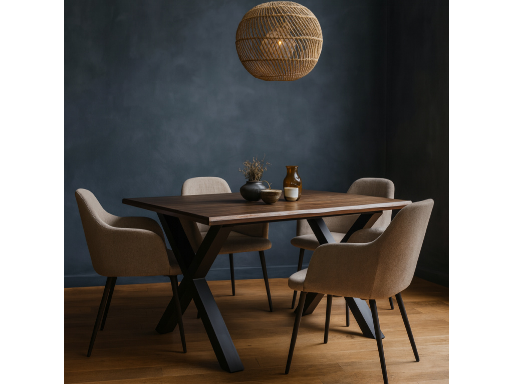 Tento jídelní stůl spojuje nadčasovou eleganci masivní dřevěné desky s výraznou kovovou podnoží do tvaru X, která mu dodává moderní industriální vzhled a zároveň maximální stabilitu. Precizně zpracovaná deska s přirozenou kresbou dřeva působí teple a přirozeně, zatímco robustní černé nohy vytvářejí výrazný kontrast a vizuální lehkost.