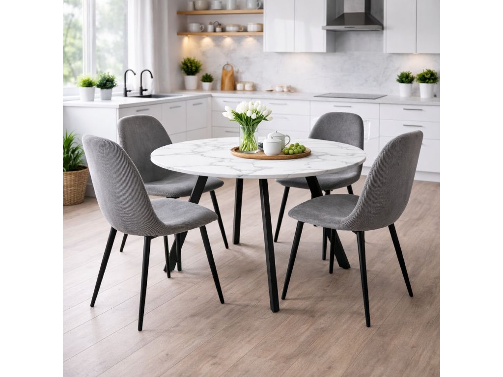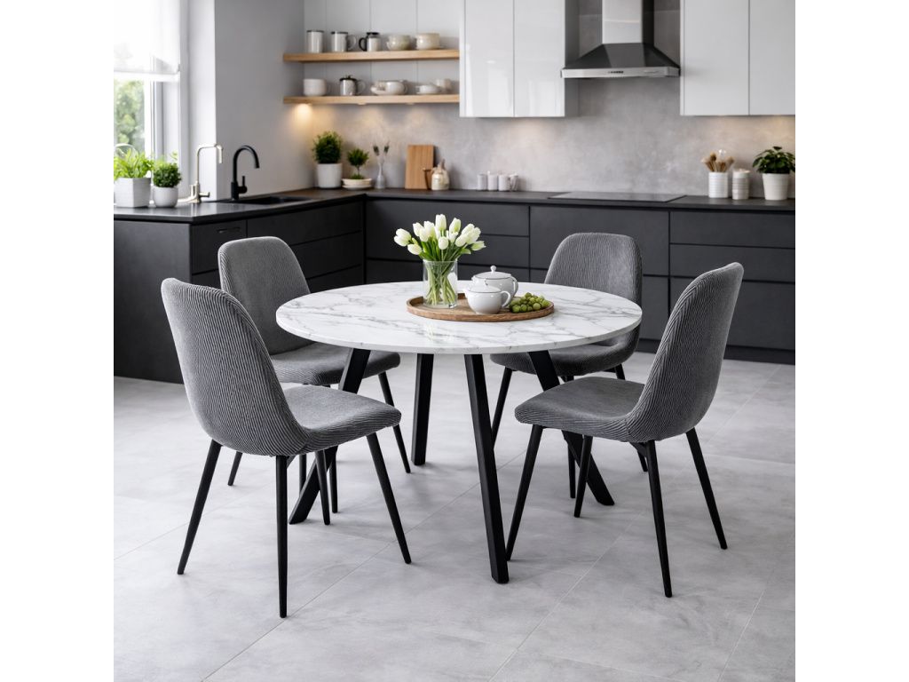 Elegantní jídelní set s mramorovým dekorem a čalouněnými židlemi v moderním provedení. Nadčasový design, který dodá vašemu interiéru klid, styl a komfort.