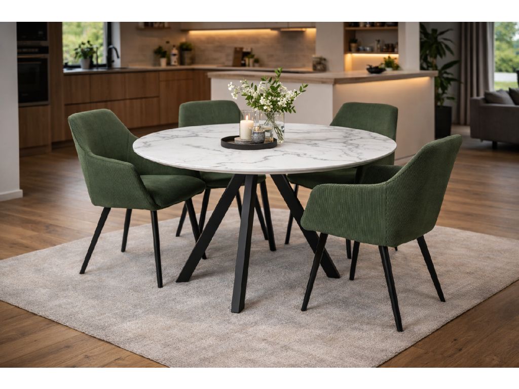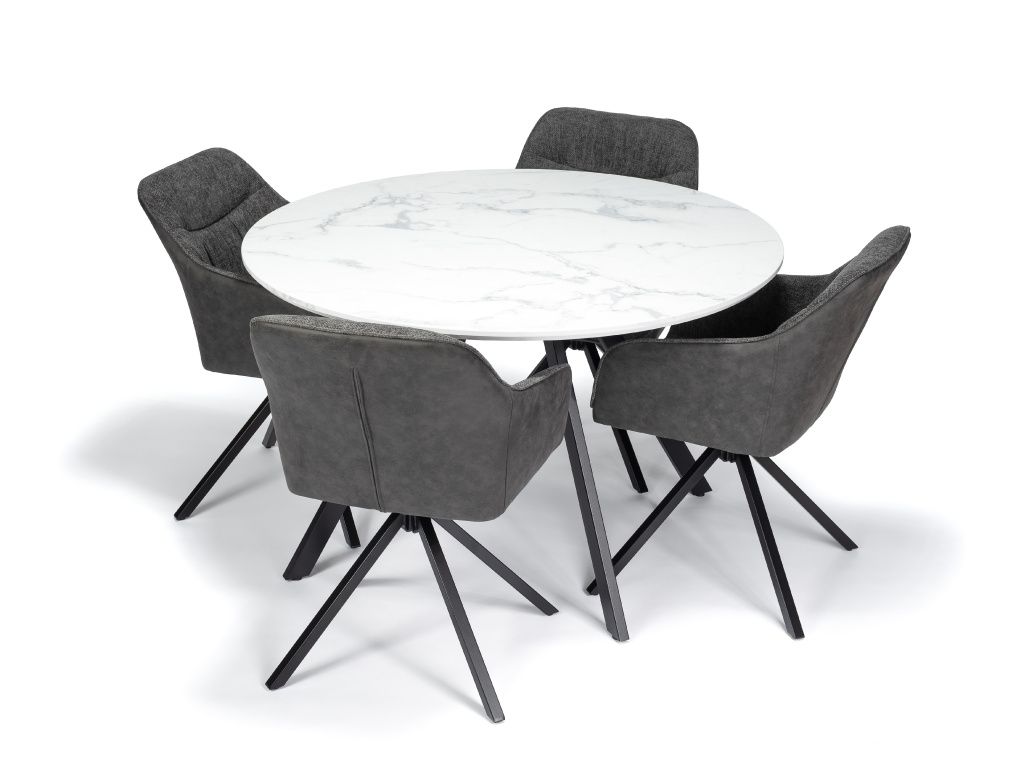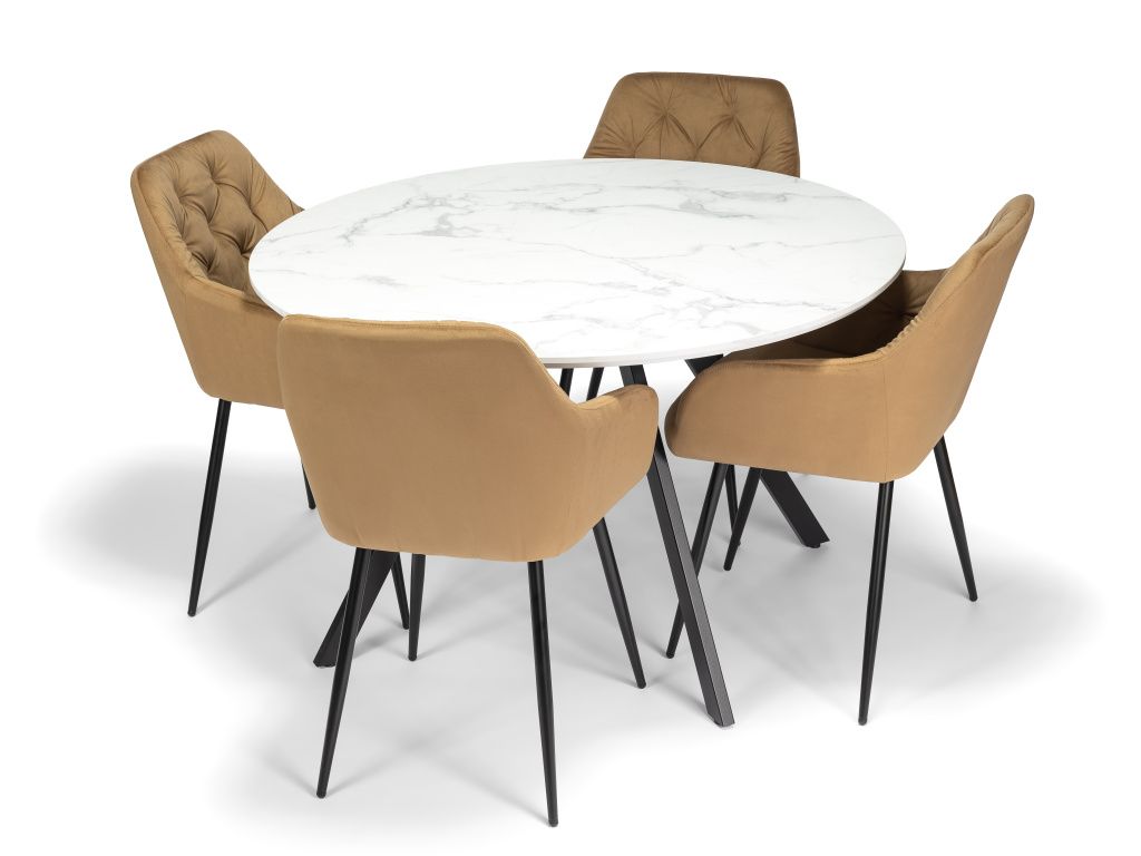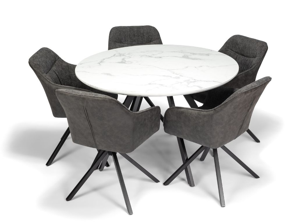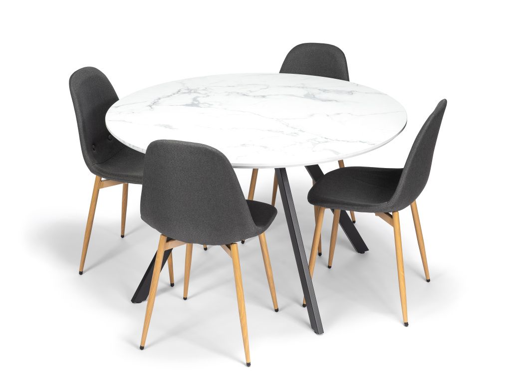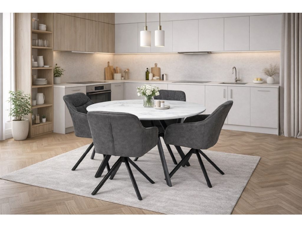 Deska stolu z MDF s kvalitní povrchovou úpravou v dekoru kamene působí luxusně a zároveň se snadno udržuje. Jemná kresba mramoru dodává stolu moderní a nadčasový vzhled, který se přirozeně hodí do světlých, minimalistických i moderních interiérů.