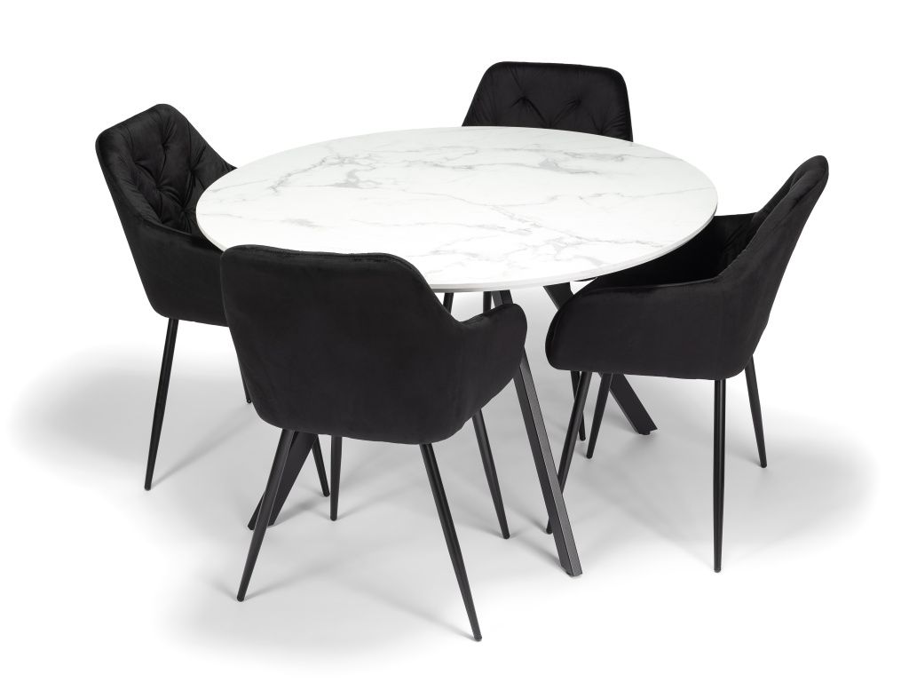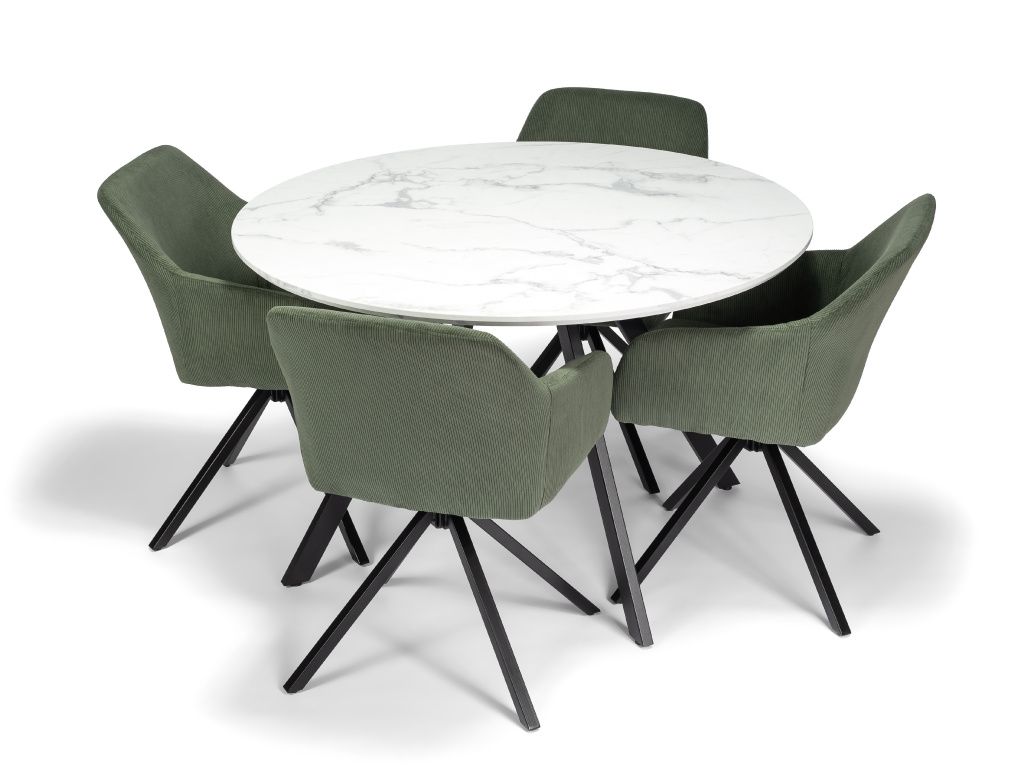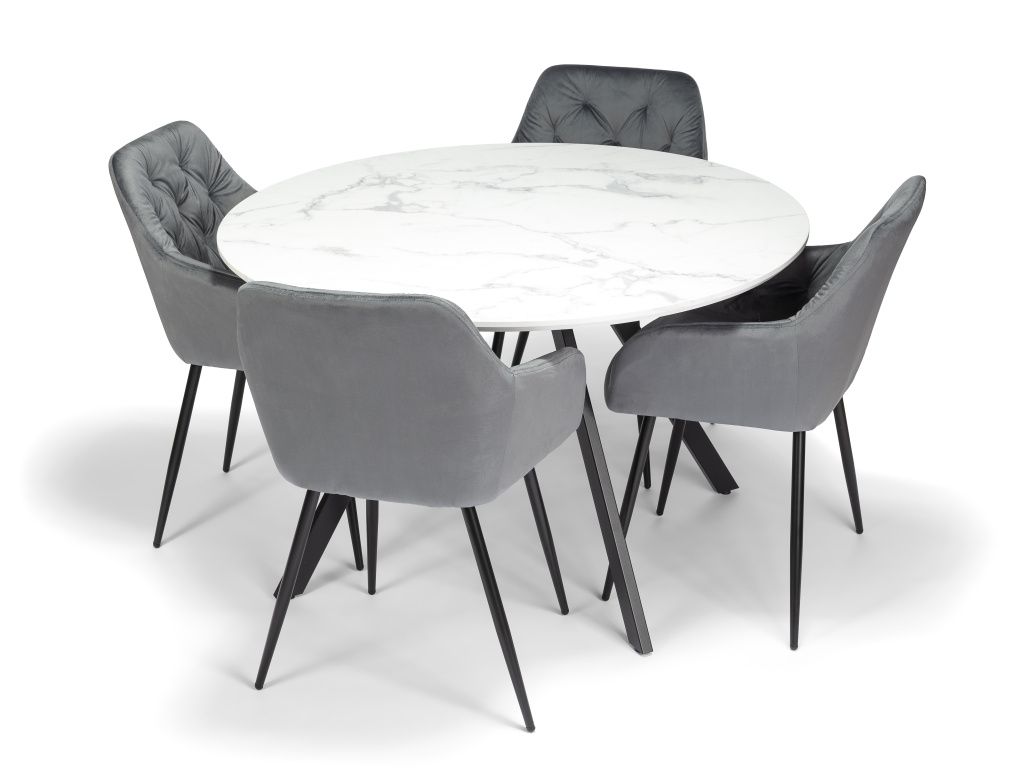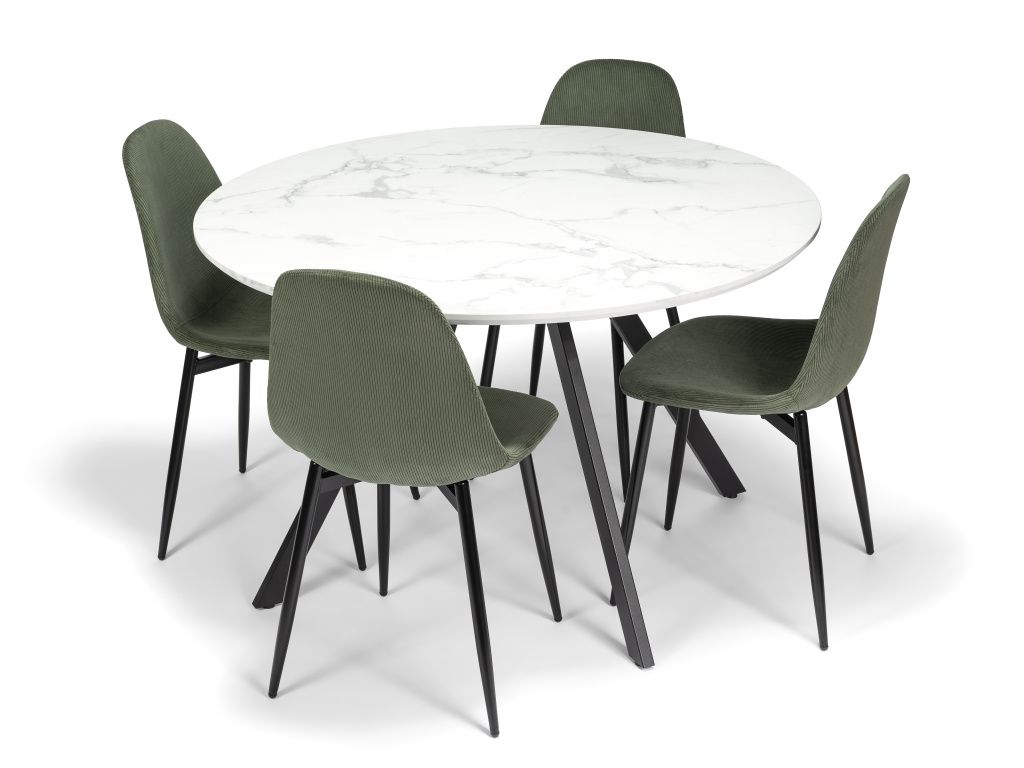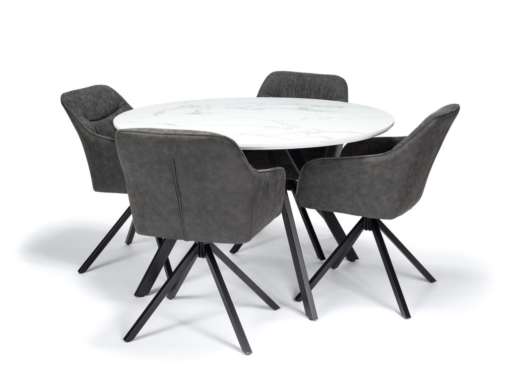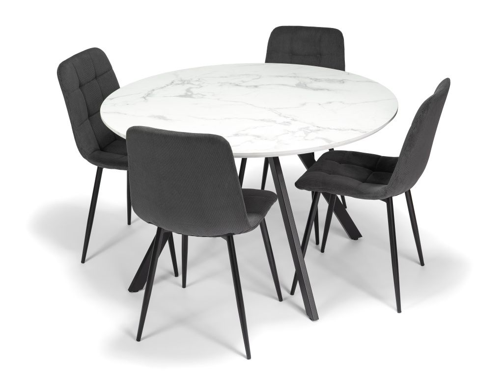Deska stolu z MDF s kvalitní povrchovou úpravou v dekoru kamene působí luxusně a zároveň se snadno udržuje. Jemná kresba mramoru dodává stolu moderní a nadčasový vzhled, který se přirozeně hodí do světlých, minimalistických i moderních interiérů.