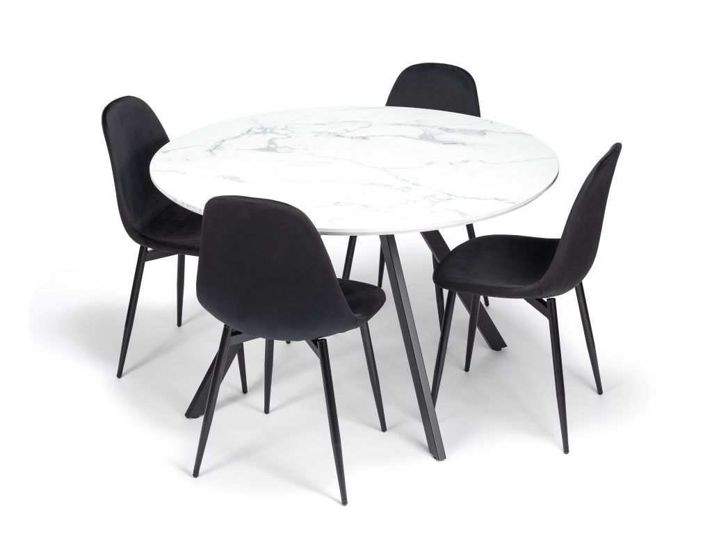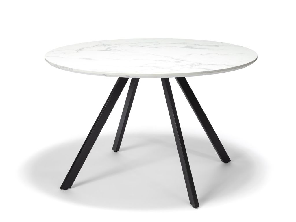 Tento elegantní jídelní stůl s deskou v dekoru bílého mramoru vytváří stylové místo pro každodenní chvíle s rodinou i přáteli. Stabilní kovová konstrukce dodává stolu moderní charakter a zajišťuje pevnost při každém společném posezení. Ke stolu se vejde pohodlně 4 - 5 lidí.