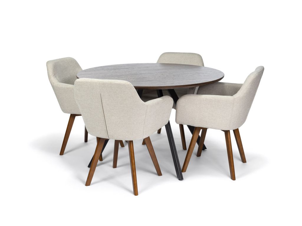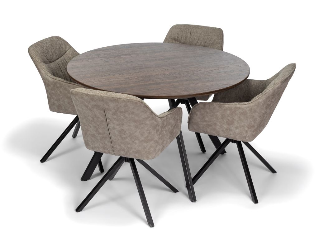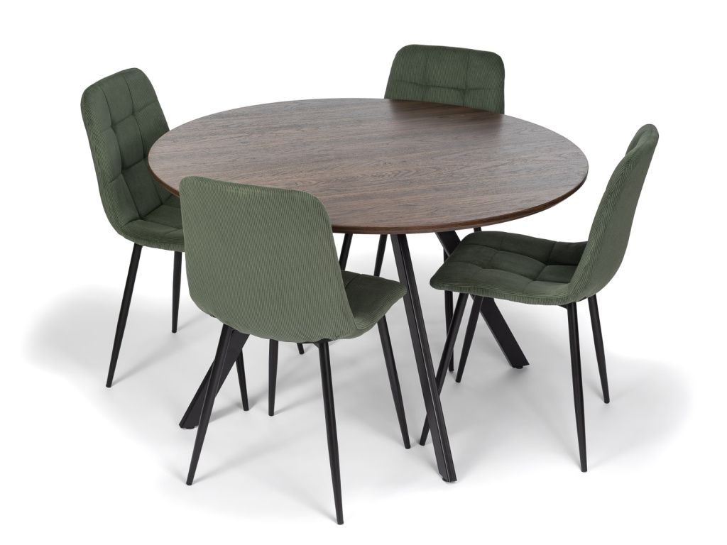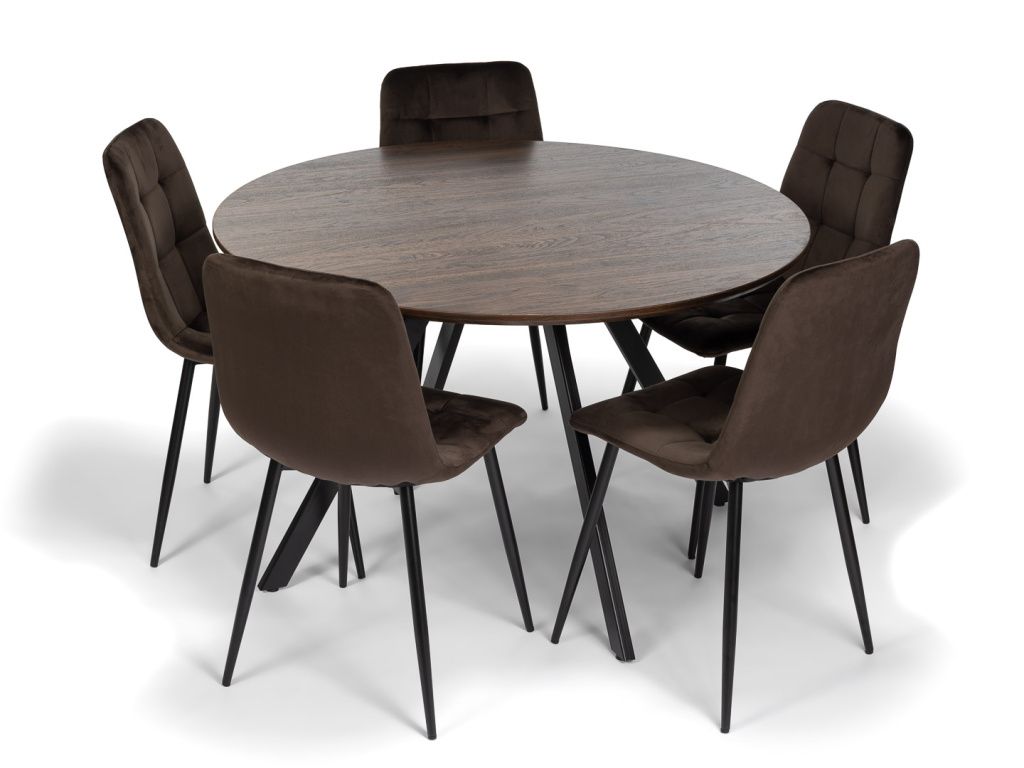 Kulatý jídelní stůl pro 4-5 osob s dřevěnou deskou v tmavém dekoru. Deska s povrchovou úpravou v dekoru tmavého dřeva, práškované ocelové podnoží v černé barvě. Vysoká stabilita.