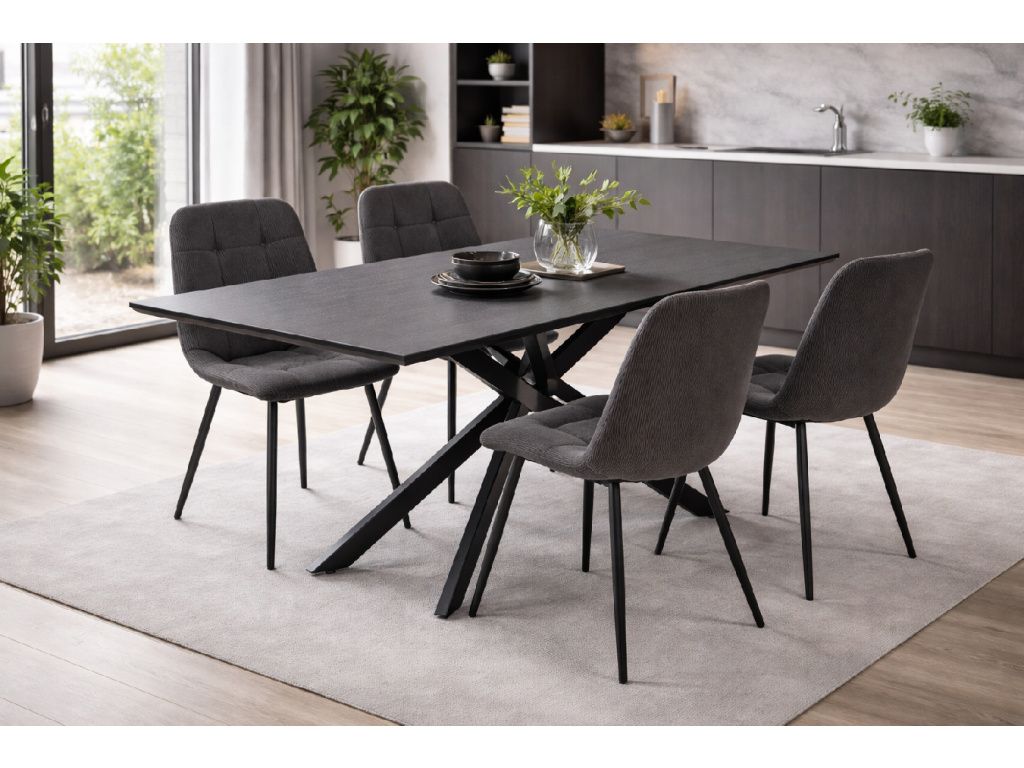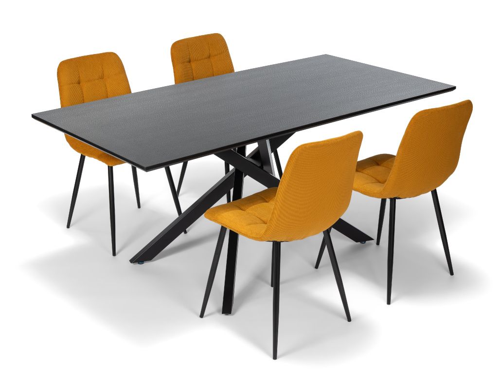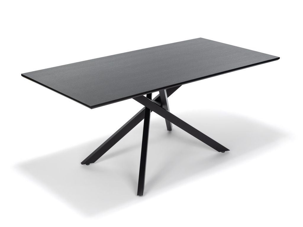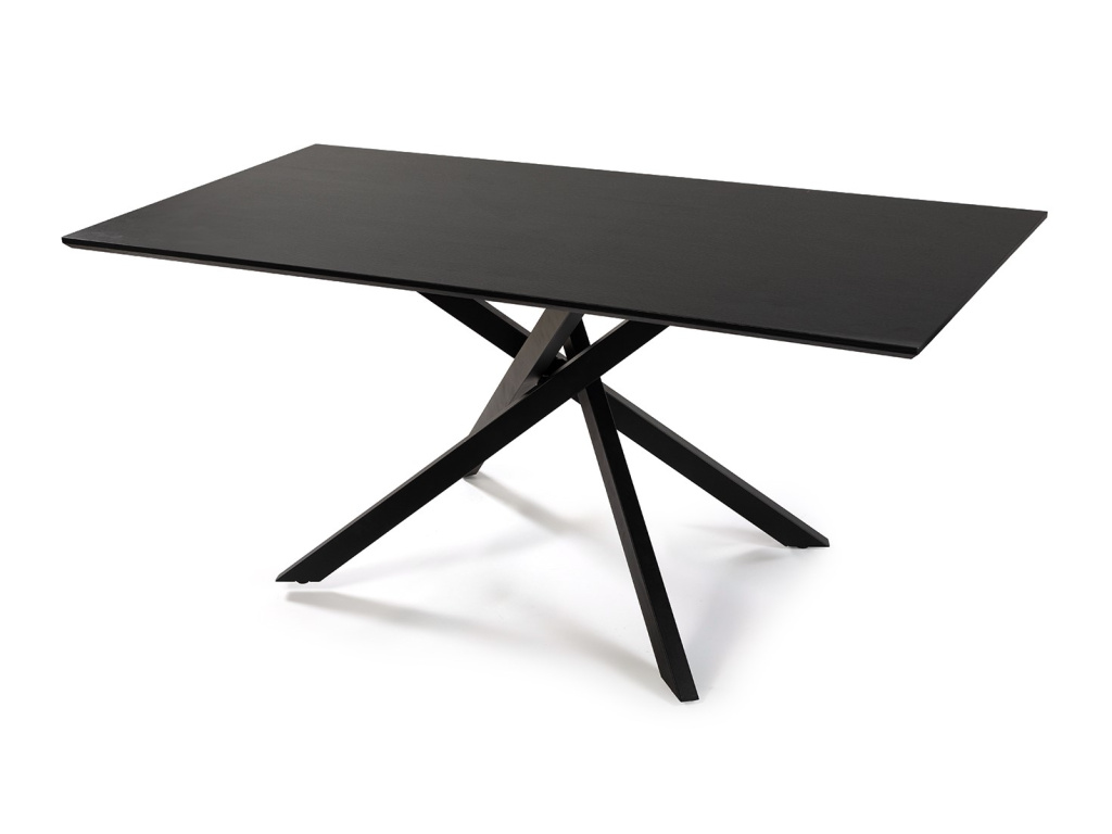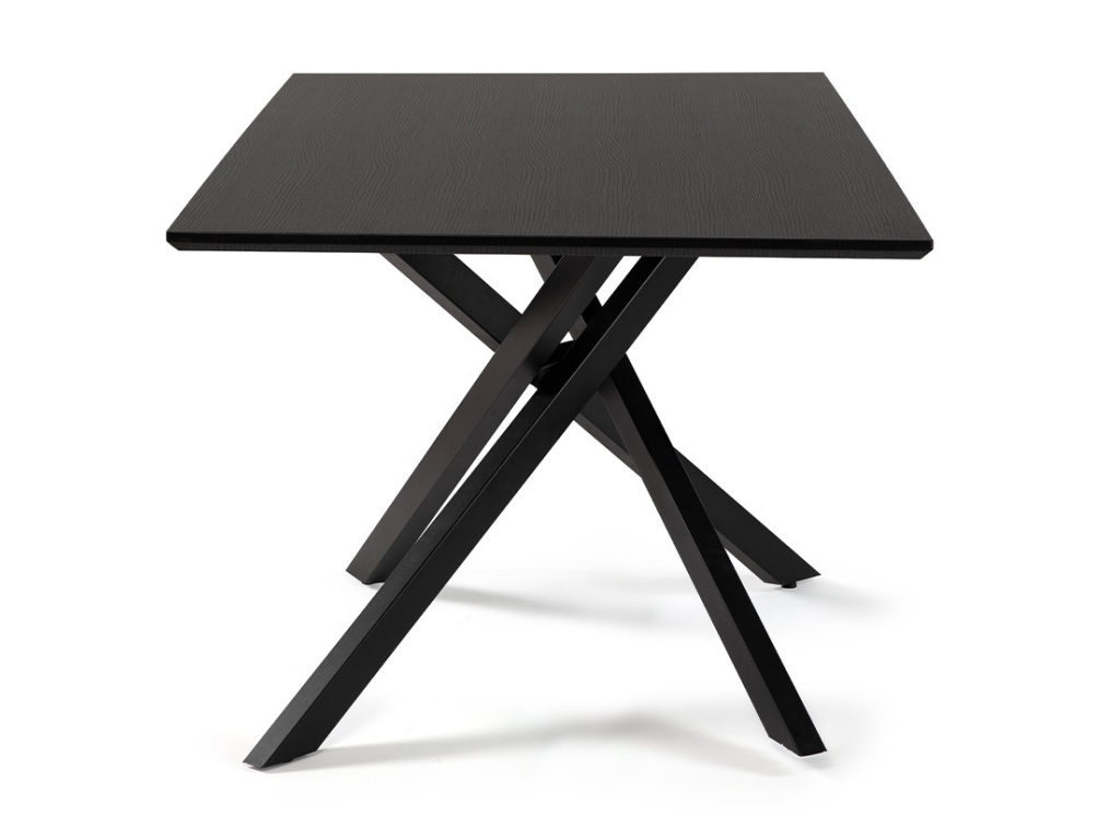 Obdélníkový jídelní stůl s výrazným moderním designem. Černá stolová deska dodává interiéru elegantní a luxusní vzhled. Stabilní kovová podnož s originálním křížením nohou. Vhodný do prostorné jídelny či moderní kuchyně. Spojuje praktičnost, pevnost a stylovou eleganci.