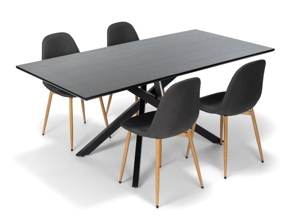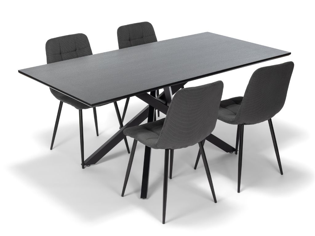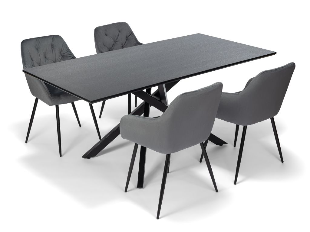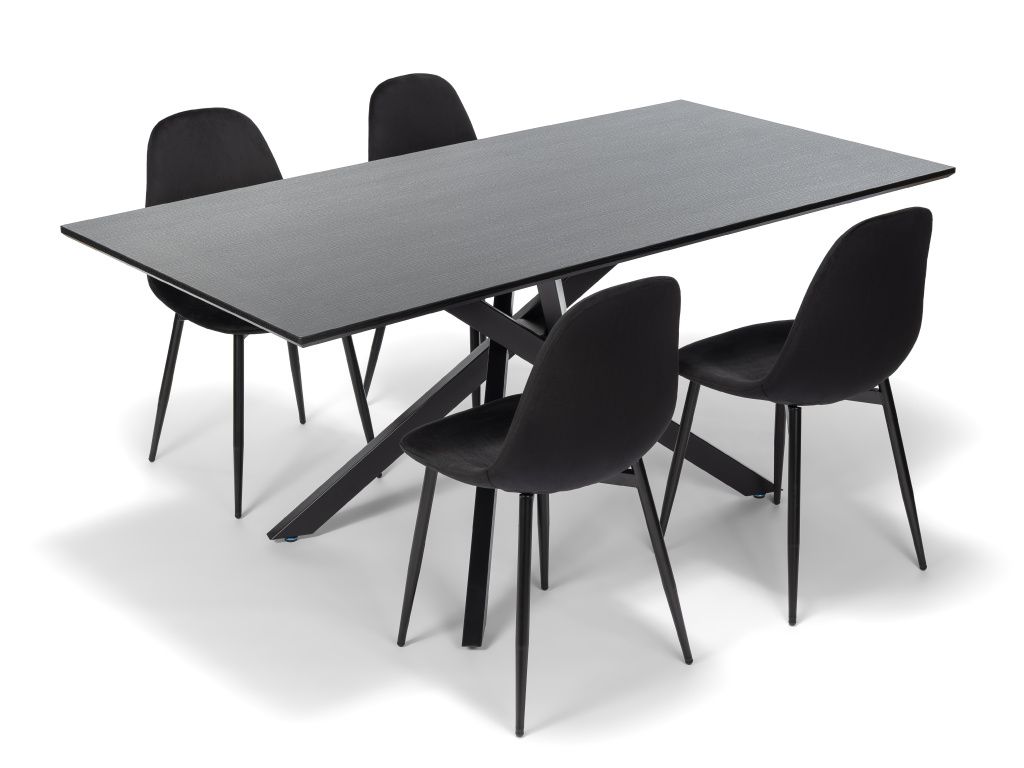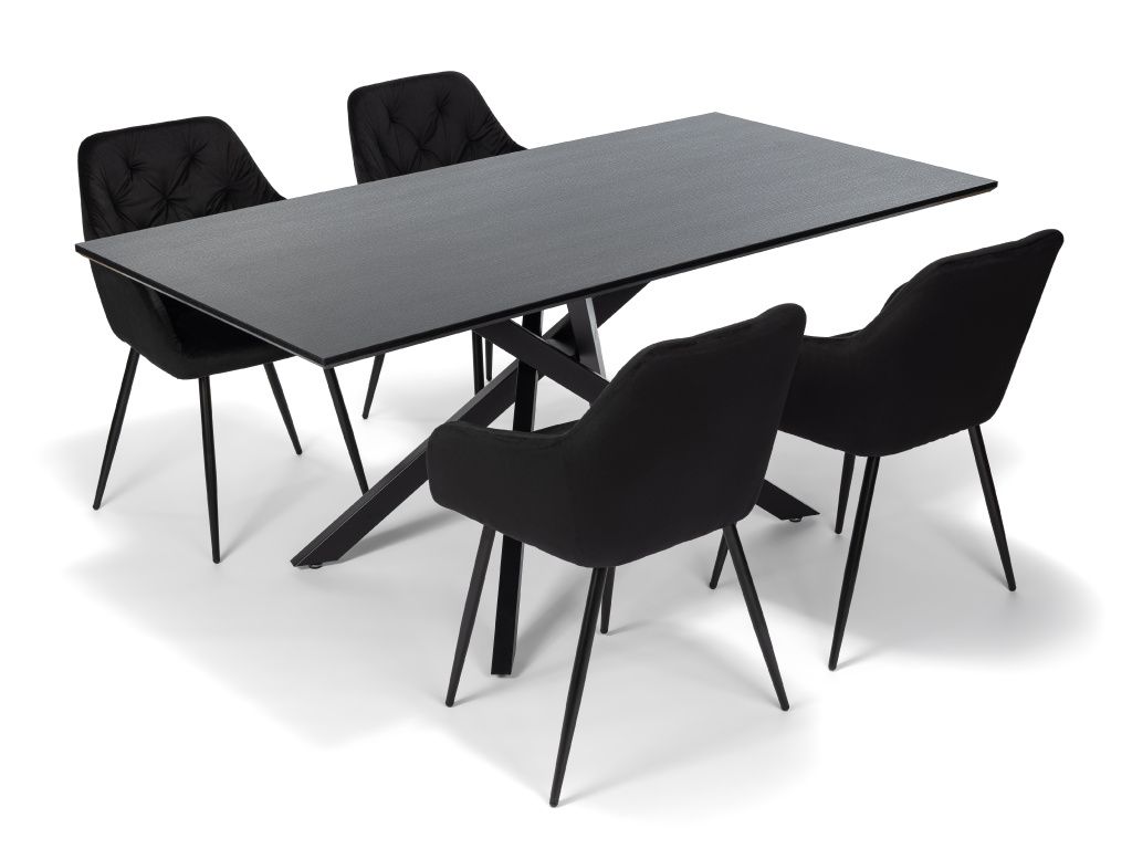 Obdélníkový jídelní stůl s výrazným moderním designem. Černá stolová deska dodává interiéru elegantní a luxusní vzhled. Stabilní kovová podnož s originálním křížením nohou. Vhodný do prostorné jídelny či moderní kuchyně. Spojuje praktičnost, pevnost a stylovou eleganci.