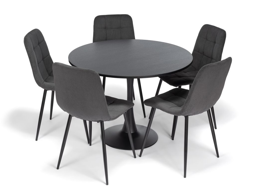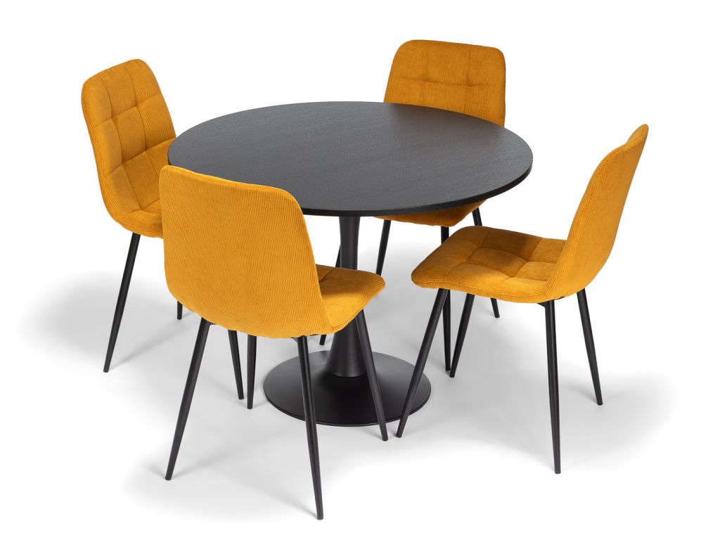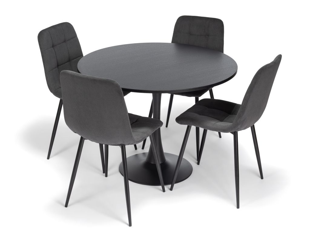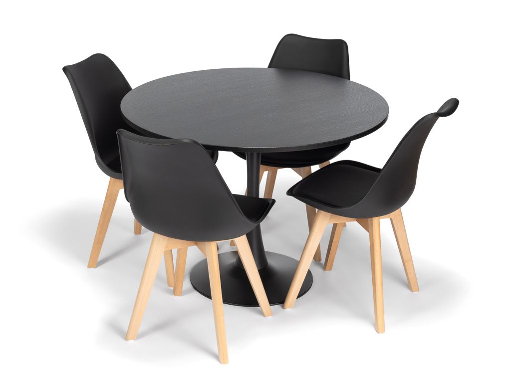 Kulatý jídelní stůl s moderním minimalistickým designem. Černá stolová deska dodává interiéru elegantní a sofistikovaný vzhled. Stabilní centrální noha zajišťuje pohodlné sezení kolem stolu. Vhodný do jídelny, kuchyně či kavárenských prostor. Spojuje styl, praktičnost a nadčasovou eleganci.