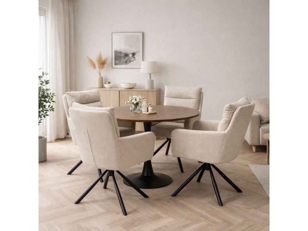 Kulatá MDF deska v dekoru tmavého dřeva dodává interiéru teplo, zatímco centrální kovová noha v černém matném provedení zajišťuje stabilitu a moderní vzhled.