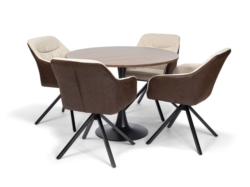 Kulatý jídelní stůl pro 4-5 osob s dřevěnou deskou v tmavém dekoru. Deska s povrchovou úpravou v dekoru tmavého dřeva, práškované ocelové podnoží v černé barvě. Vysoká stabilita.