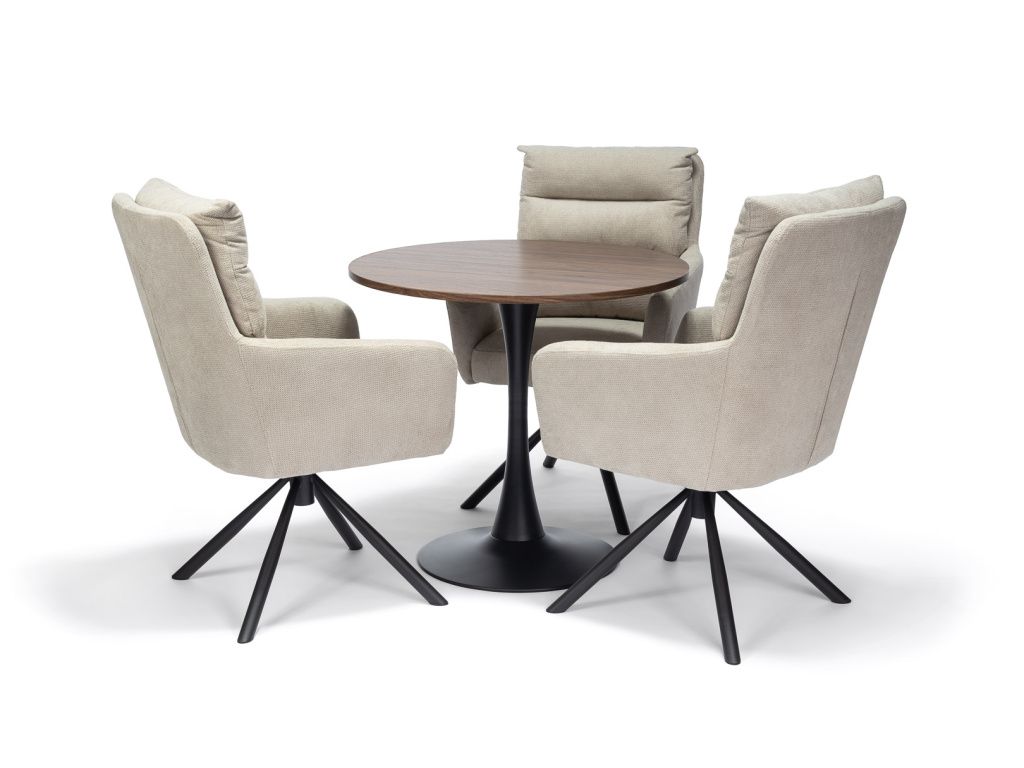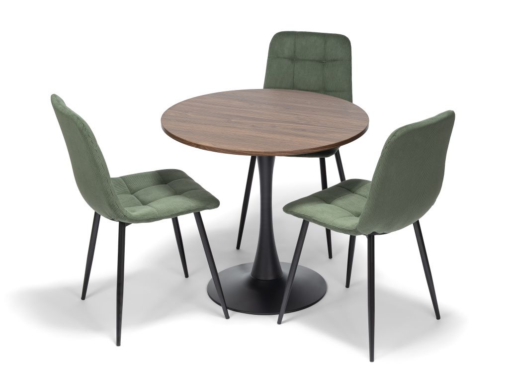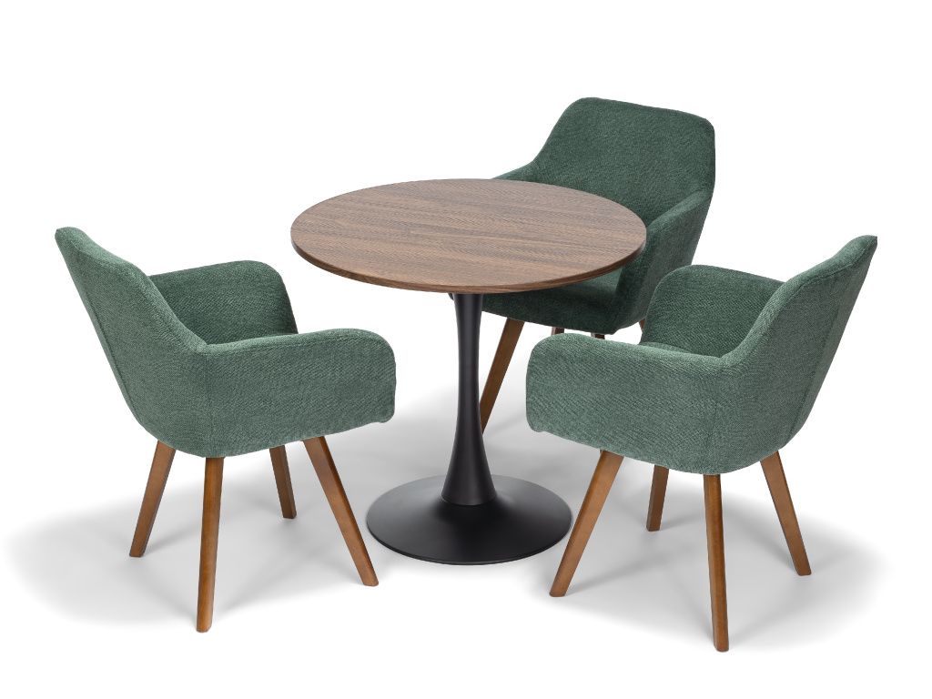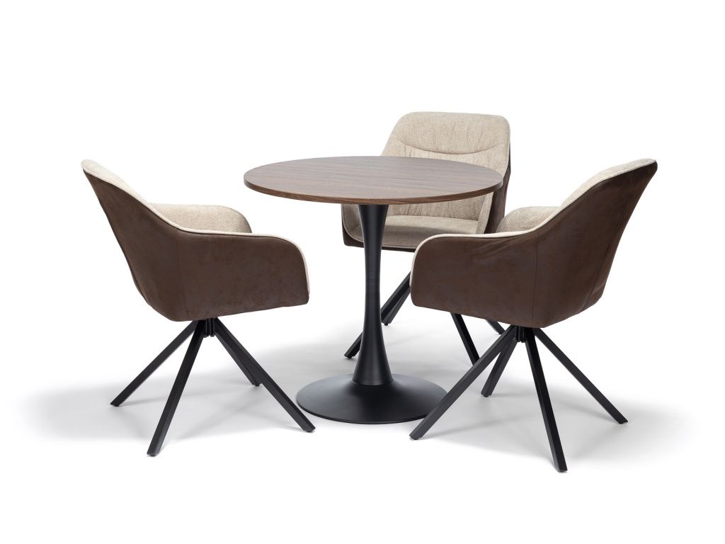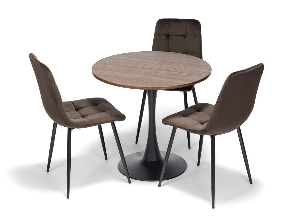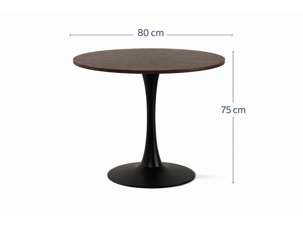 Kulatý jídelní stůl pro 3-4 osoby s dřevěnou deskou v tmavém dekoru. Deska s povrchovou úpravou v dekoru tmavého dřeva, práškované ocelové podnoží v černé barvě. Vysoká stabilita.