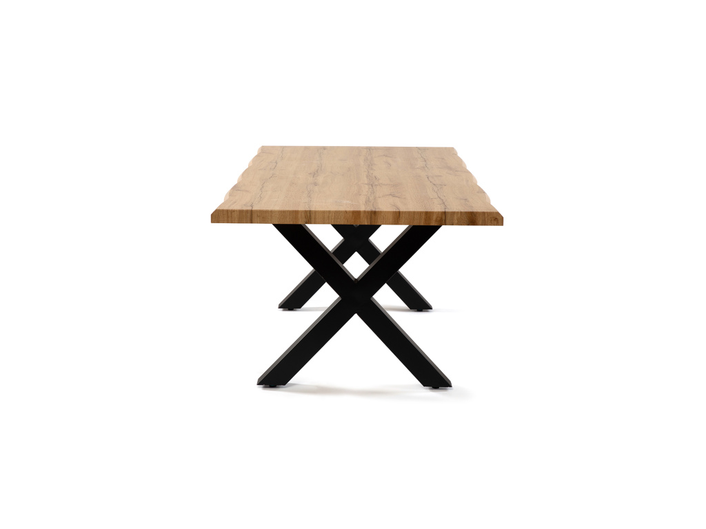 Deska v přírodním dekoru dřeva s krásně viditelnou kresbou působí hřejivě a útulně, zatímco robustní kovová podnož ve tvaru písmene X dodává stolu pevnost a charakter.