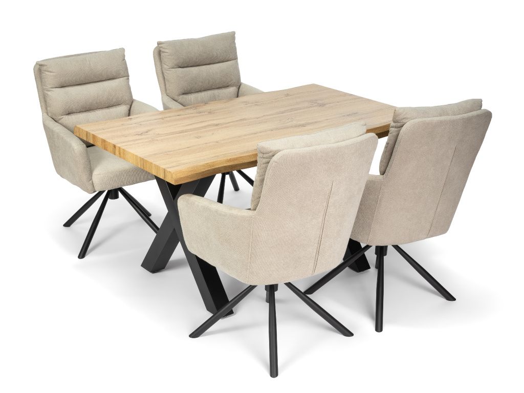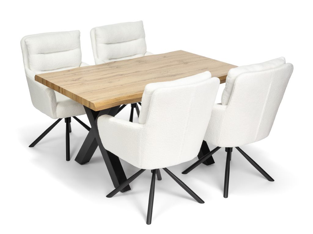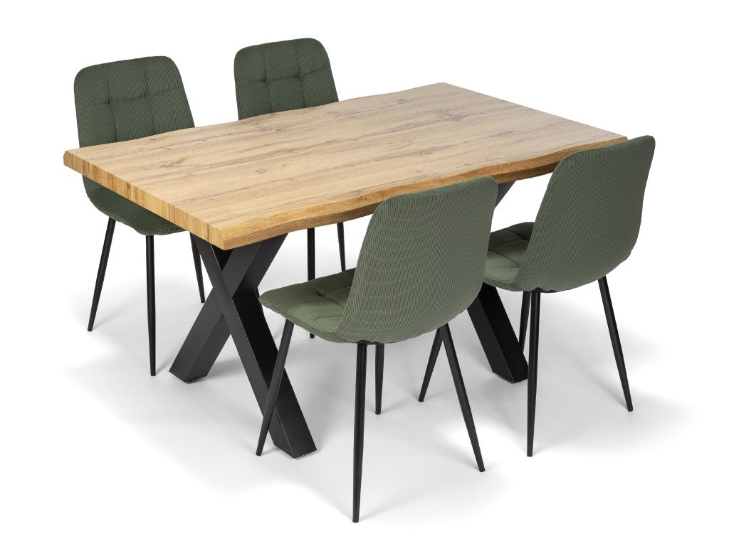 Jídelní stůl v industriálním stylu je výrazným prvkem každé jídelny. Kombinace masivně působící dubové desky v přírodním dekoru a stabilních kovových noh ve tvaru X vytváří harmonii mezi teplem dřeva a surovostí kovu. Tento kontrast dodává interiéru charakter, originalitu a nadčasový vzhled, který nepodléhá trendům.