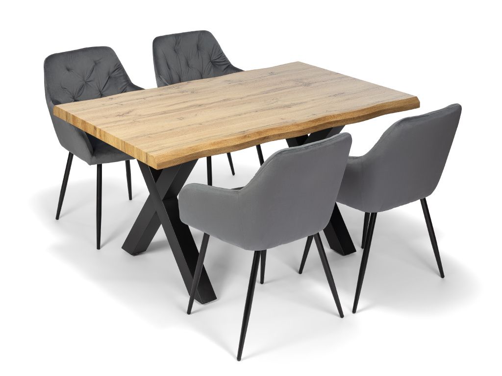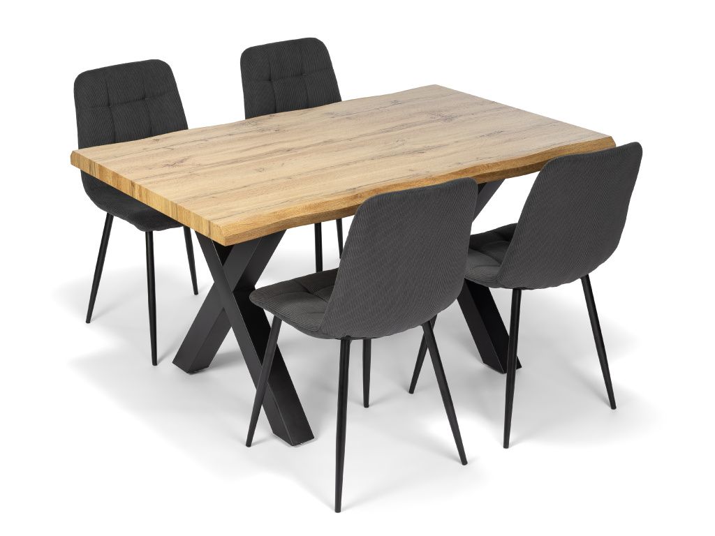 Jídelní stůl s designovou dřevěnou deskou a přírodními hranami. Ochranná 3D fólie. Práškované ocelové podnoží v černé barvě. Vhodné pro 4 lidi.