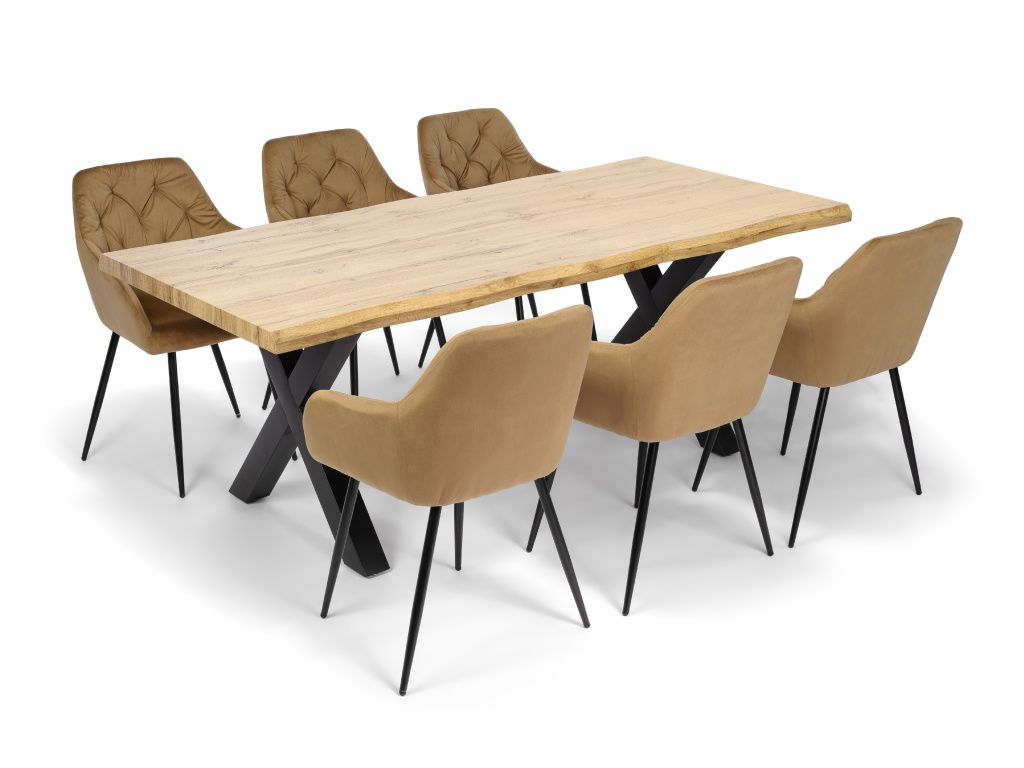Jídelní stůl s designovou dřevěnou deskou a přírodními hranami. Ochranná 3D fólie. Práškované ocelové podnoží v černé barvě. Vhodné až pro 6 osob po stranách + 2 místa u čela..