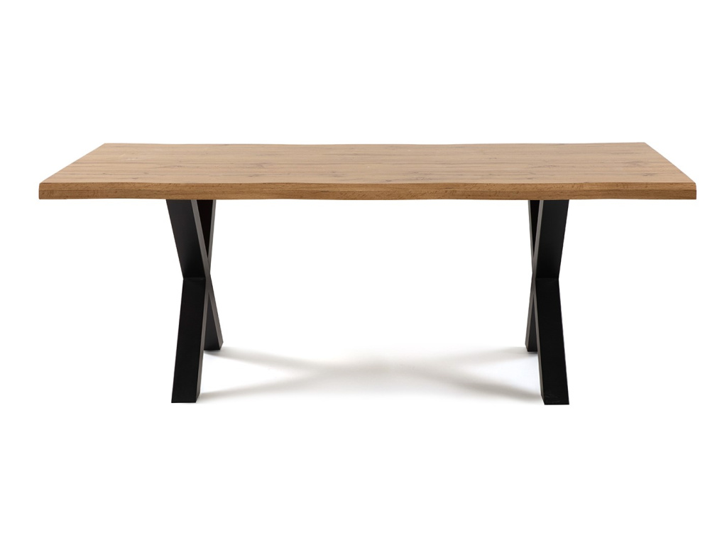 Moderní jídelní stůl s industriálním designem. Stolová deska v přírodním dekoru dřeva s výraznou kresbou. Robustní kovová podnož v černém provedení ve tvaru „X“. Ideální do prostorné jídelny či moderní kuchyně. Spojuje odolnost, praktičnost a stylový vzhled.