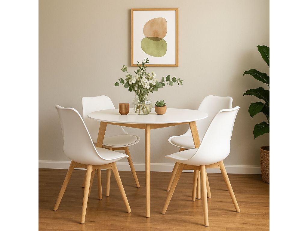 Moderní jídelní set v minimalistickém skandinávském stylu spojuje čisté linie, světlé barvy a přírodní dřevo. Kulatý stůl o průměru 105 cm doplňují čtyři pohodlné židle, které vytvářejí ideální prostor pro každodenní stolování i příjemná setkání.