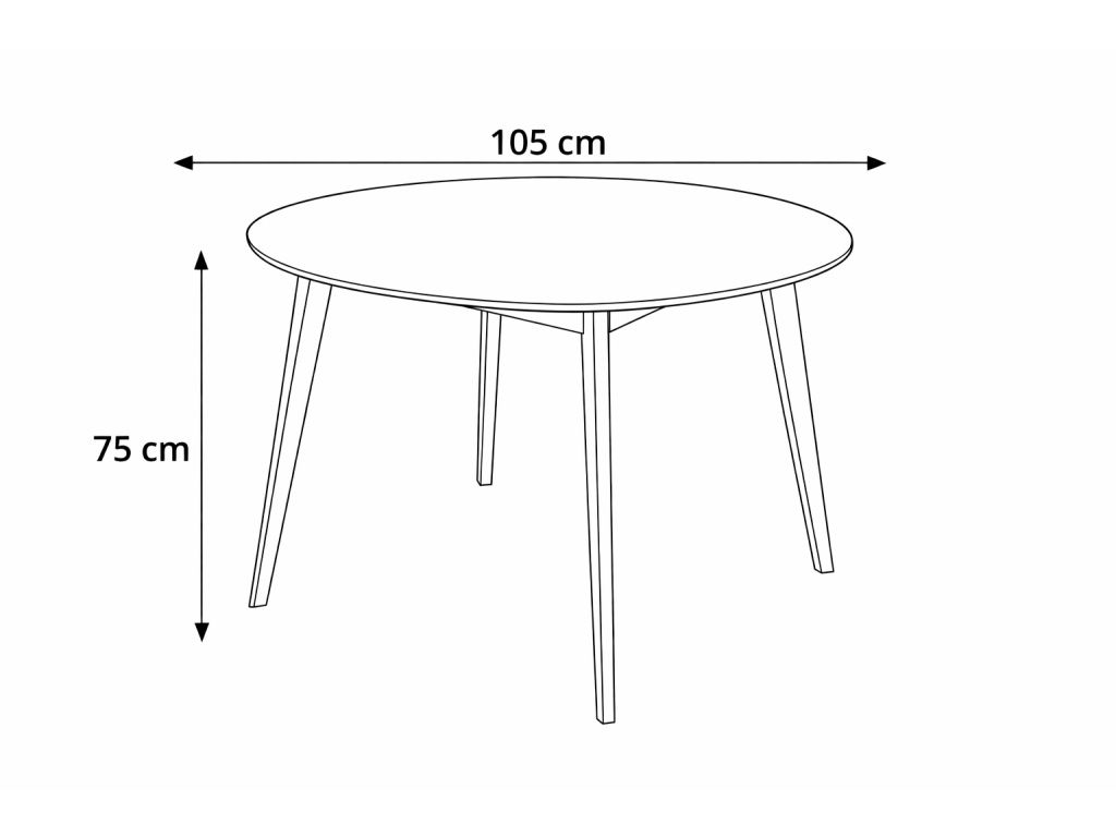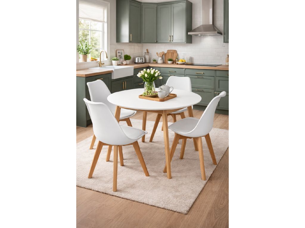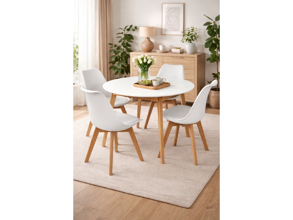 Dominantou setu je kulatý jídelní stůl o průměru 105 cm, který nabízí dostatek prostoru pro pohodlné stolování až čtyř osob. Jeho čistá bílá deska působí lehce a vzdušně, zatímco stabilní dřevěné nohy dodávají celku pevnost a přírodní charakter.