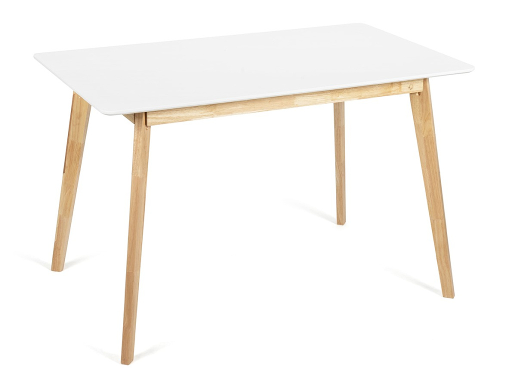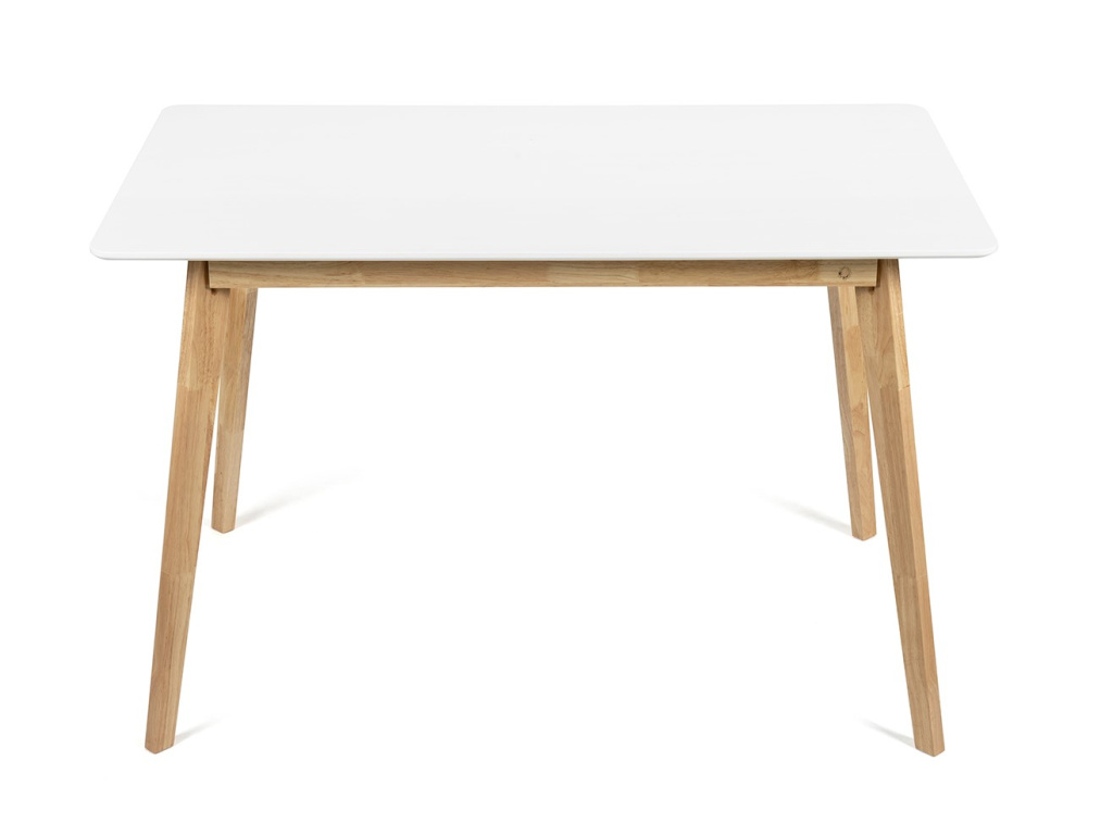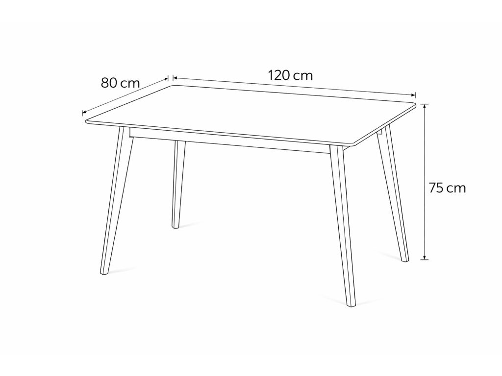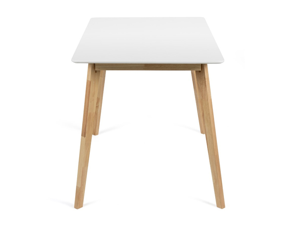 Obdélníkový jídelní stůl s moderním skandinávským designem. Bílá stolová deska dodává interiéru čistý a elegantní vzhled. Stabilní nohy z přírodního dřeva pro hřejivý dojem. Vhodný do jídelny, kuchyně či menších bytových prostor. Spojuje jednoduchost, praktičnost a nadčasový styl.