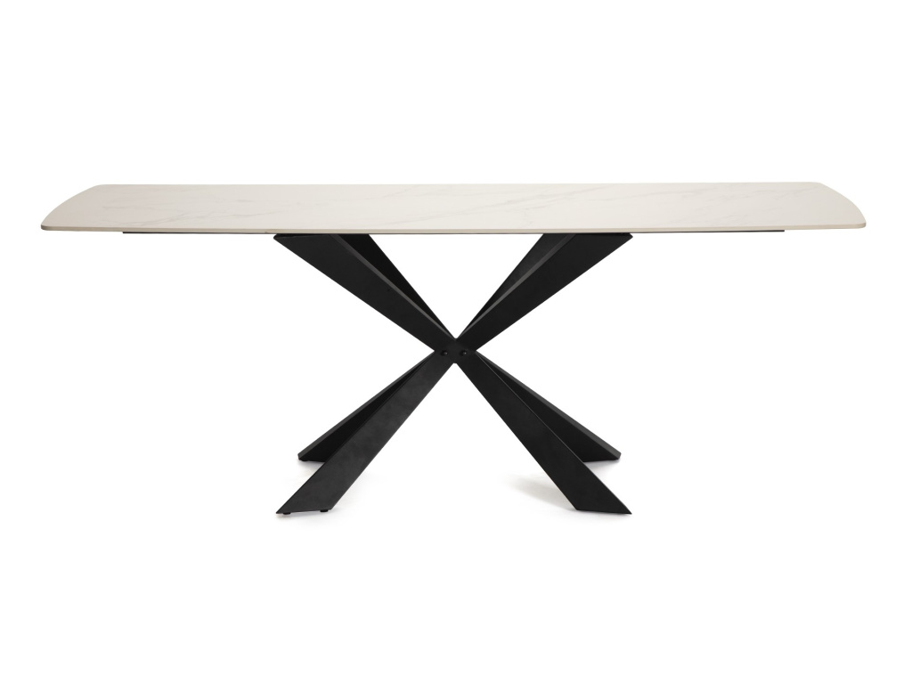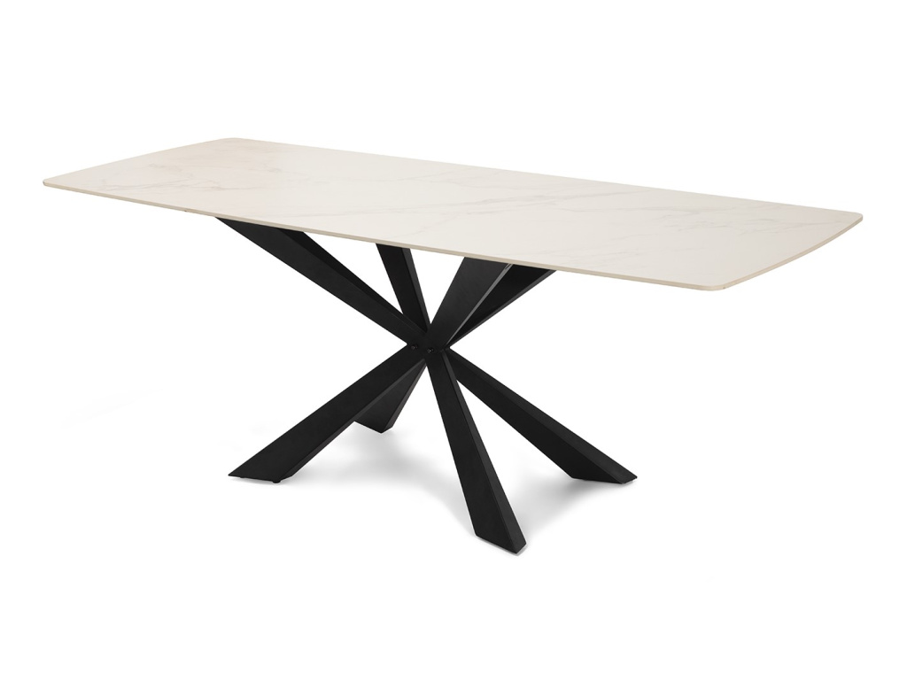 Obdélníkový jídelní stůl s luxusním moderním designem. Stolová deska v bílé barvě s elegantním mramorovým dekorem. Stabilní kovová podnož v černém provedení s originálním křížením nohou. Vhodný do prostorné jídelny či stylového interiéru. Spojuje praktičnost, odolnost a sofistikovaný vzhled.
