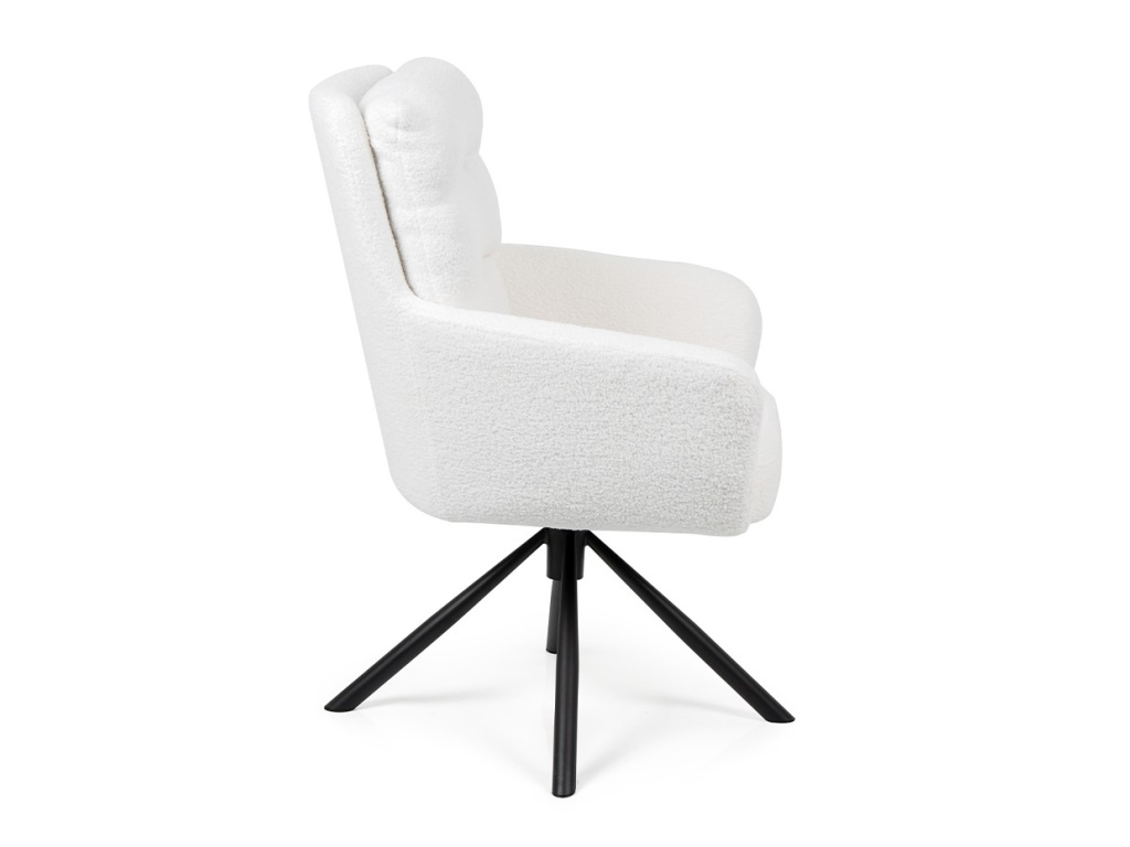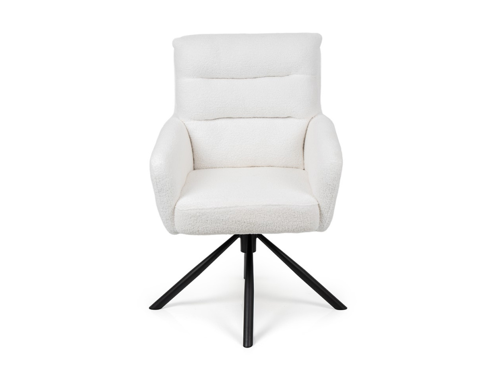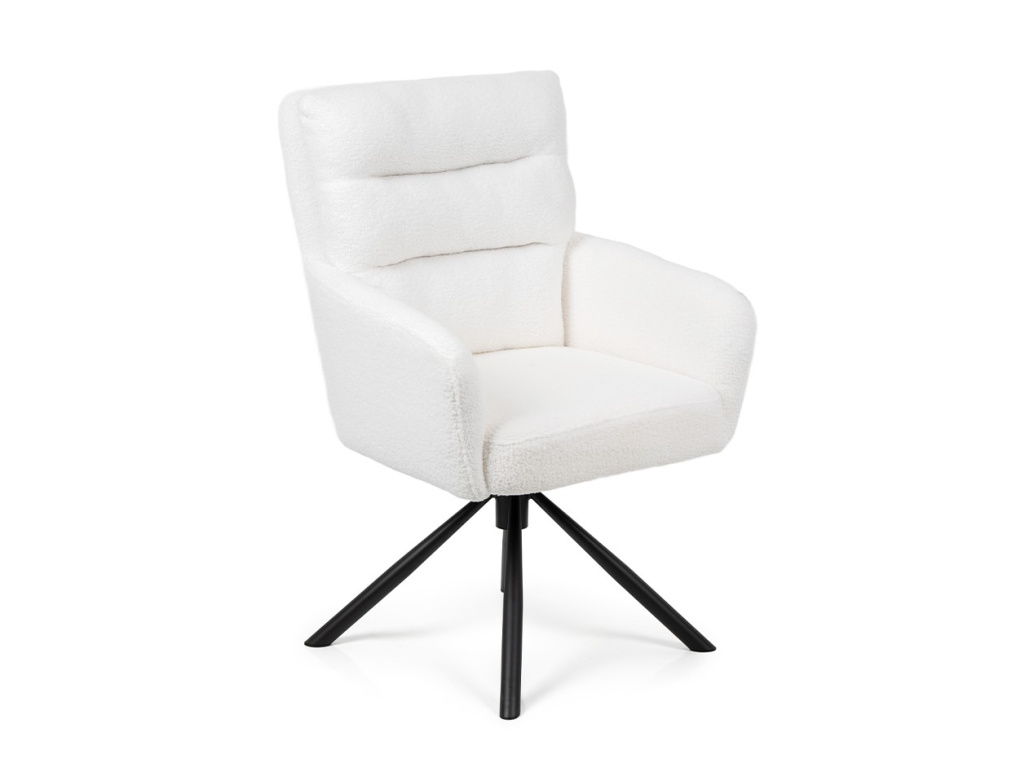 Moderní otočná židle s područkami a elegantním vzhledem. Pohodlné čalounění v bílé látce s měkkým povrchem. Stabilní kovová podnož s otočnou funkcí. Skvěle se hodí do jídelny, pracovny i kanceláře. Spojuje komfort, luxusní design a nadčasovou eleganci.