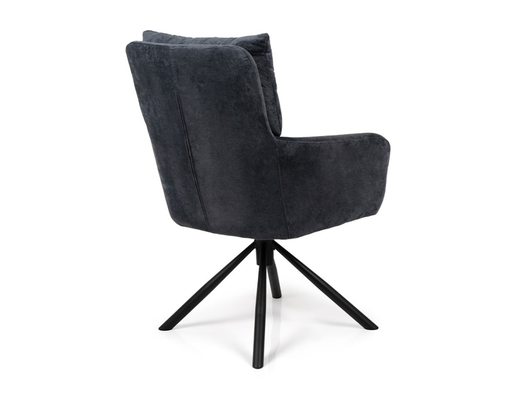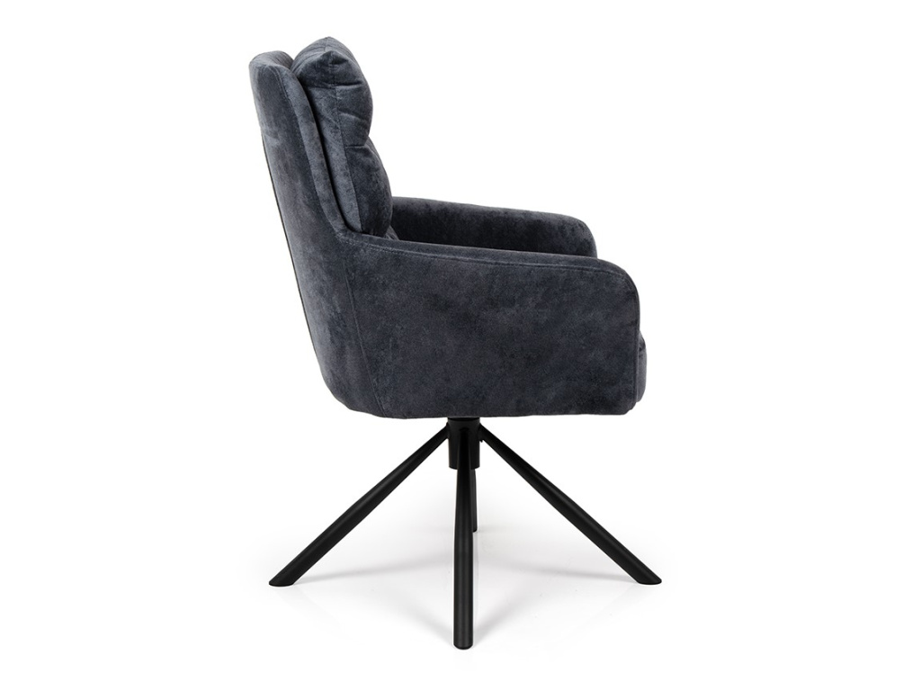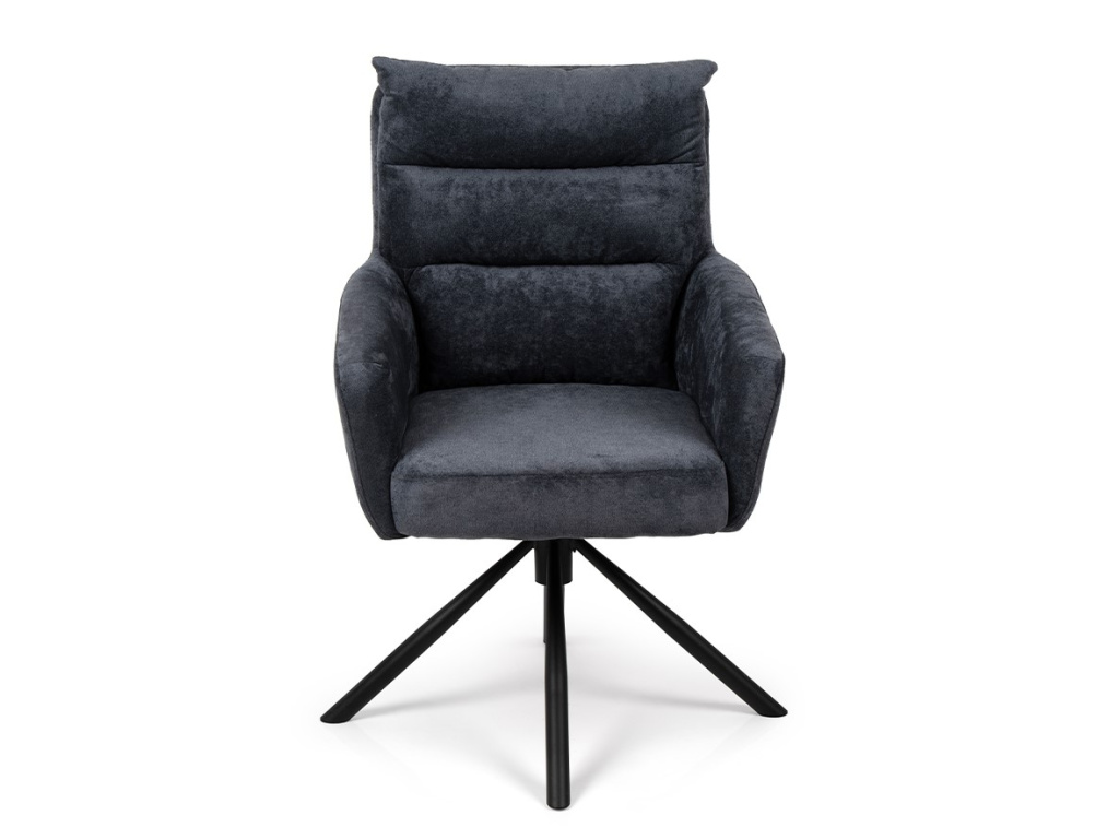 Moderní židle s područkami a elegantním vzhledem. Pohodlné čalounění v tmavě šedé látce s měkkým polstrováním. Stabilní kovová podnož s otočnou funkcí. Skvěle se hodí do jídelny, pracovny i kanceláře. Spojuje komfort, praktičnost a stylový design.