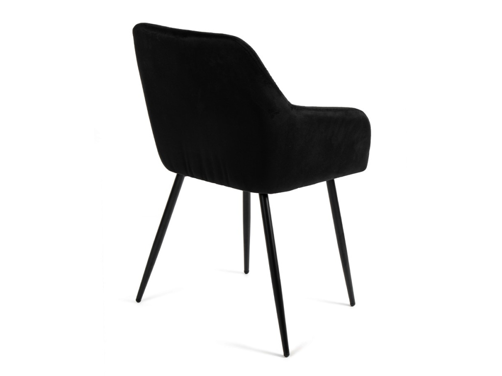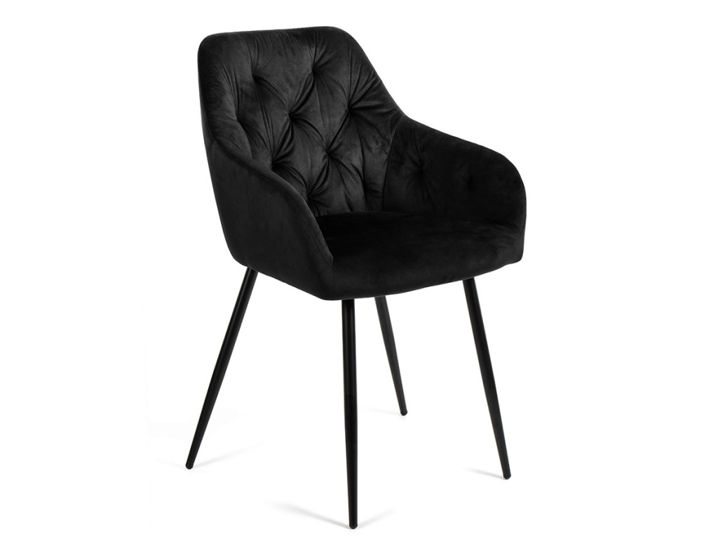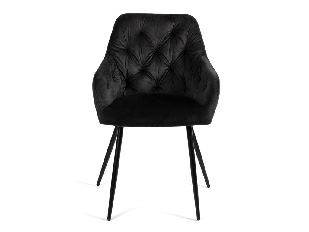 Moderní židle s elegantním designem a područkami. Pohodlné čalounění v černém sametu s dekorativním prošíváním. Stabilní kovové nohy v černém provedení. Vhodná do jídelny, pracovny i obývacího pokoje. Spojuje komfort, styl a luxusní vzhled.