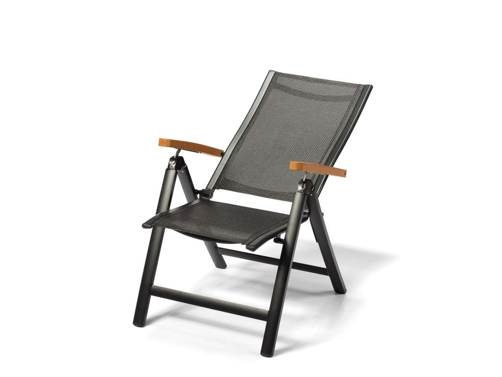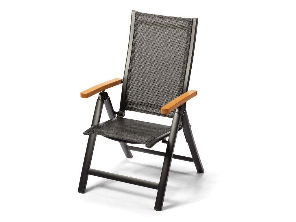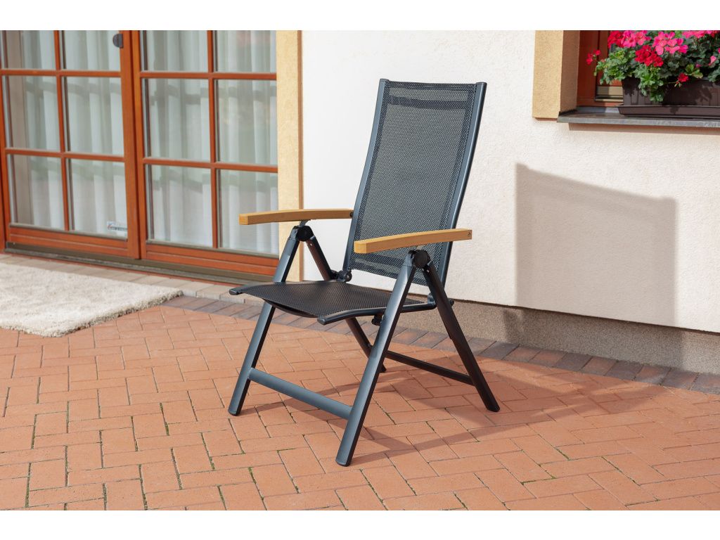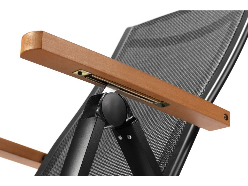 Skládací a polohovací zahradní židle s hliníkovým rámem a artwoodovými područkami v přírodní barvě, černý textilen 4x4, 96x53x89 cm.