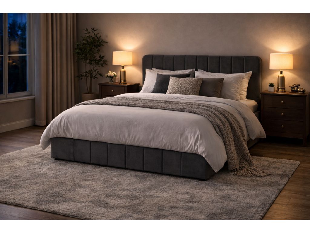 Čalouněná postel s úložným prostorem, překližka s pěnovou výplní a sametovým potahem, ocelový rám s hydraulickým zvedáním.