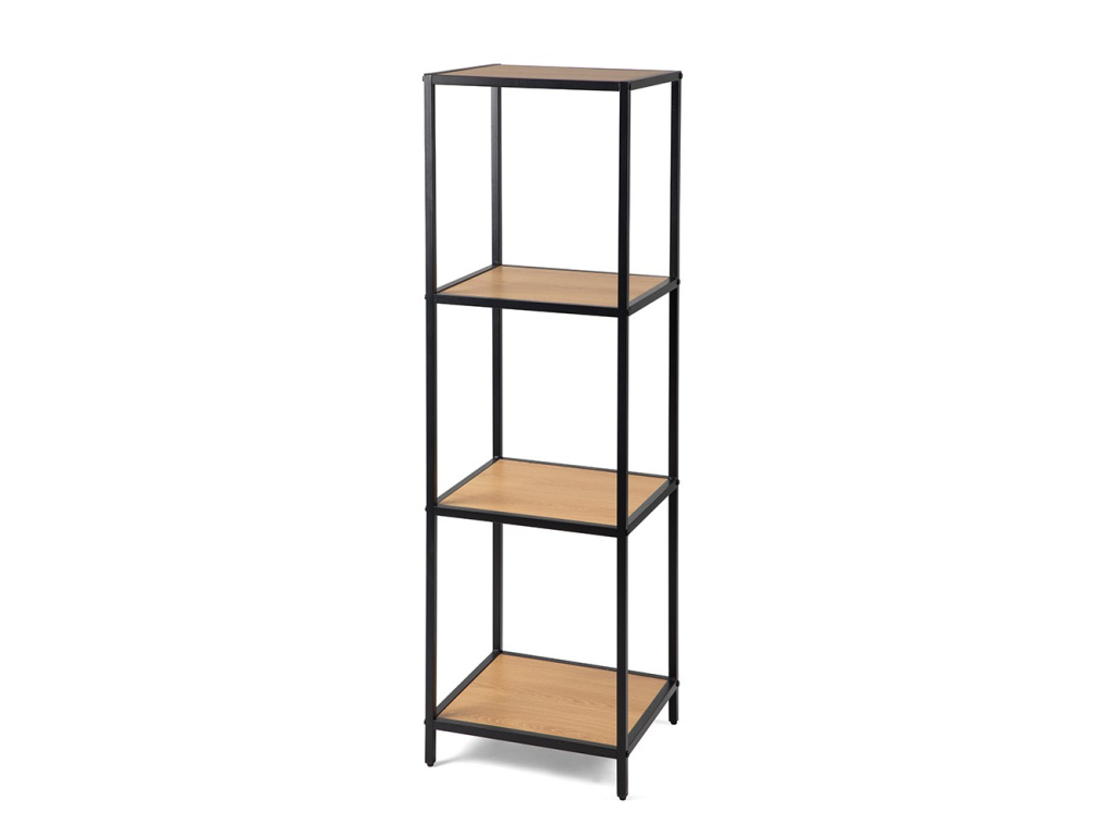 Moderní policový díl s minimalistickým designem. Čtyři praktické police v dekoru přírodního dřeva. Stabilní kovová konstrukce v černém provedení. Ideální pro ukládání knih, dekorací či drobných předmětů. Spojuje funkčnost, jednoduchost a industriální styl.