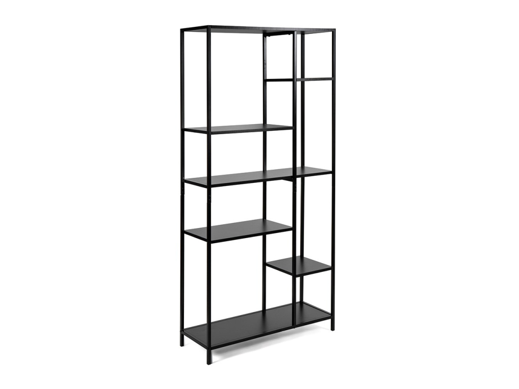 Praktický otevřený regál s kovovým rámem a policemi nabízí funkční úložný prostor s odlehčeným vzhledem. Díky asymetrickému rozložení polic působí zajímavě a zároveň poskytuje místo pro knihy, dekorace nebo doplňky.