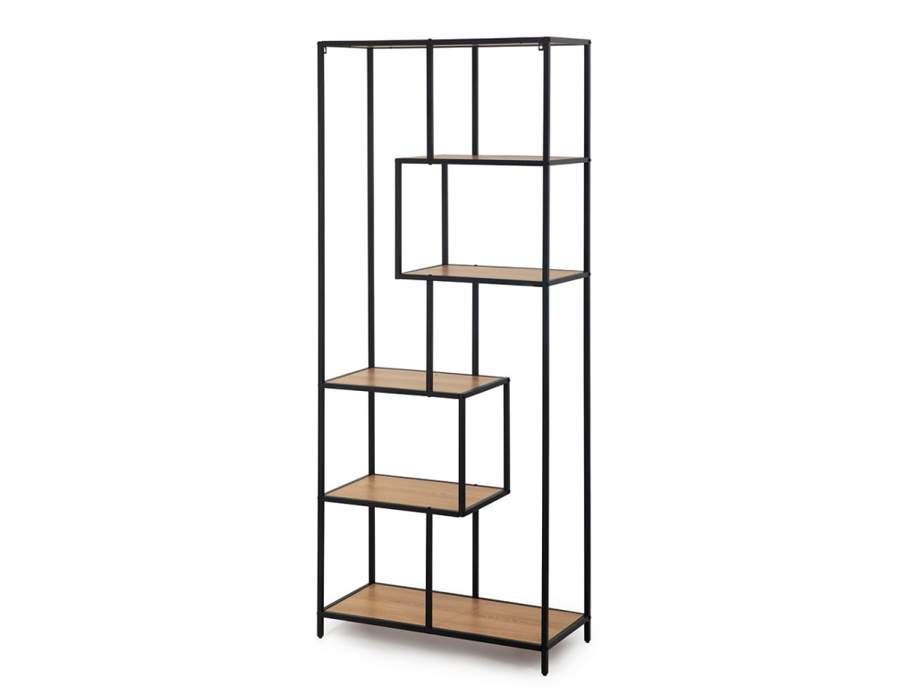 Praktický otevřený regál s kovovým rámem a policemi v dekoru přírodního dřeva nabízí funkční úložný prostor s odlehčeným vzhledem. Díky asymetrickému rozložení polic působí zajímavě a zároveň poskytuje místo pro knihy, dekorace nebo doplňky.