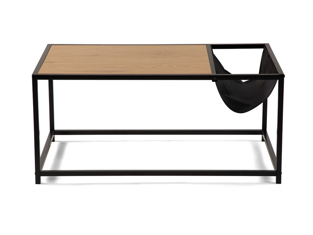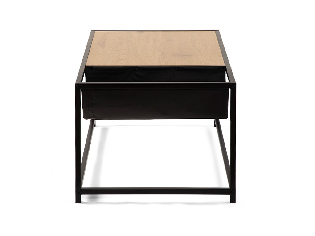Moderní konferenční stolek s praktickým designem. Stolová deska v dekoru přírodního dřeva dodává elegantní vzhled. Stabilní kovová konstrukce v černém provedení. Integrovaný textilní úložný prostor ideální na časopisy či drobnosti. Spojuje funkčnost, praktičnost a stylový vzhled.