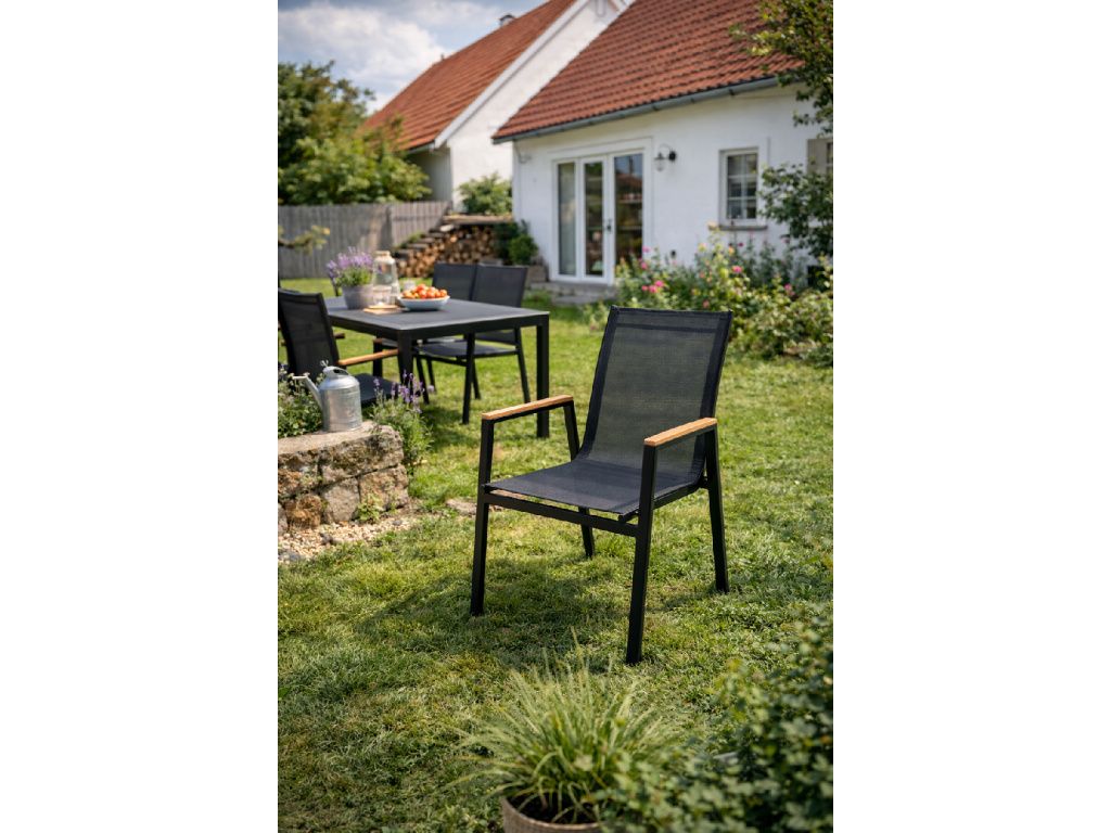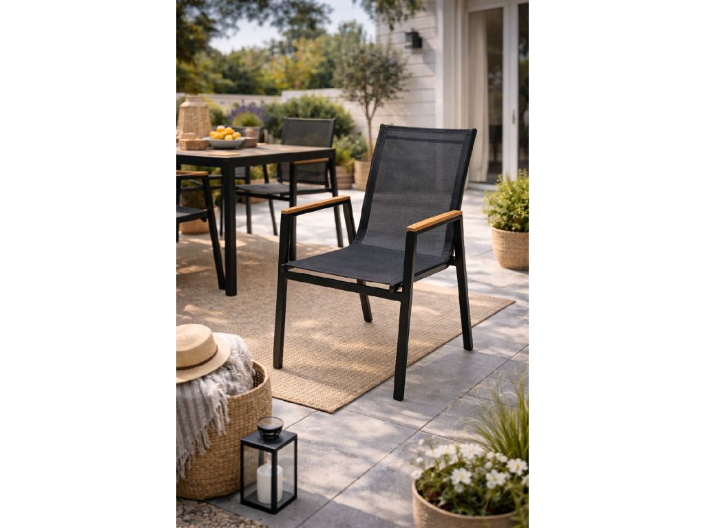 Elegantní zahradní židle s područkami vyniká moderním designem a vysokým komfortem sezení. Pevná kovová konstrukce v kombinaci s prodyšným textilním výpletem zajišťuje stabilitu, dlouhou životnost a pohodlí i při delším posezení. Jemně tvarované opěradlo se přizpůsobí tělu, zatímco dřevěné zakončení područek dodává židli přírodní a nadčasový vzhled. Díky svému univerzálnímu stylu se skvěle hodí na terasu, balkon i zahradu a snadno se kombinuje s různými typy venkovních stolů. Ideální volba pro komfortní venkovní stolování i relax.