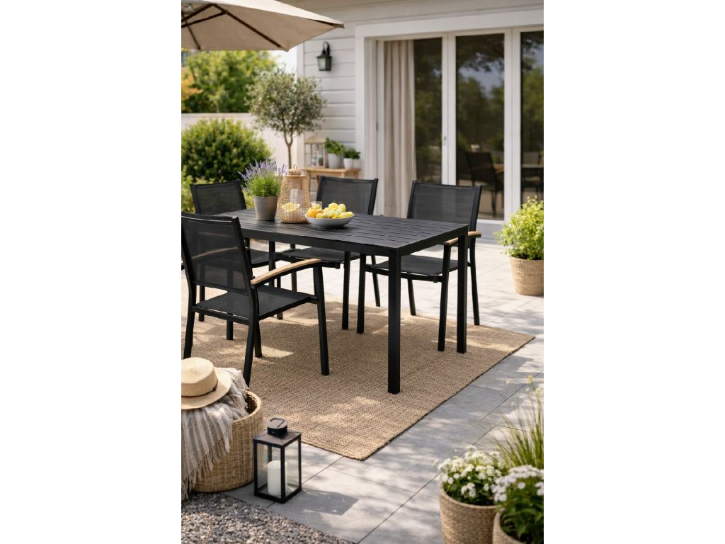 Spojuje stabilní hliníkovou konstrukci v elegantní černé barvě s moderní lamelovou deskou, která dodává celku lehkost a současný vzhled. Čisté linie působí nadčasově a snadno je sladíte s různými typy židlí i doplňků. Stůl nepůsobí těžkopádně, ale zároveň dává jasně najevo, že něco vydrží.
