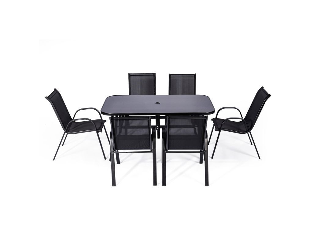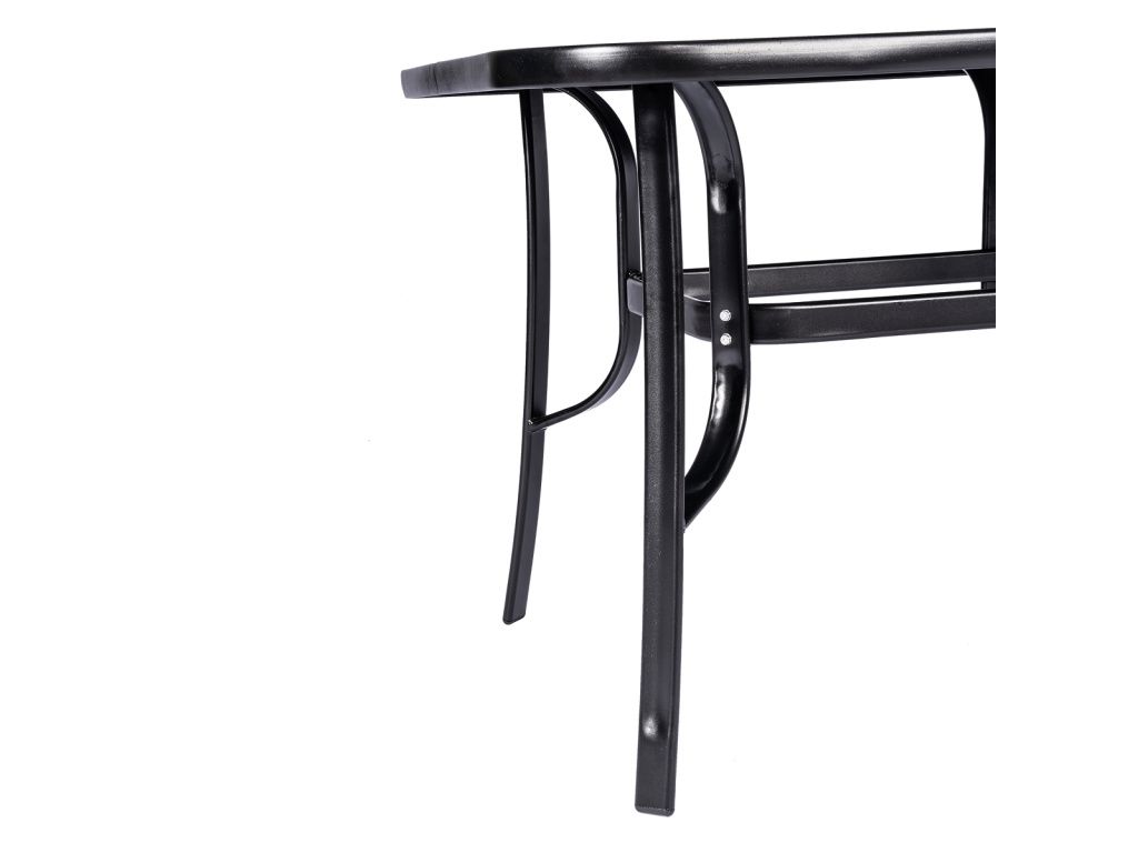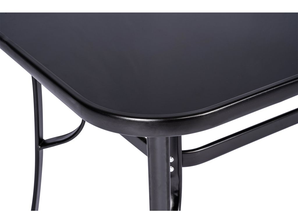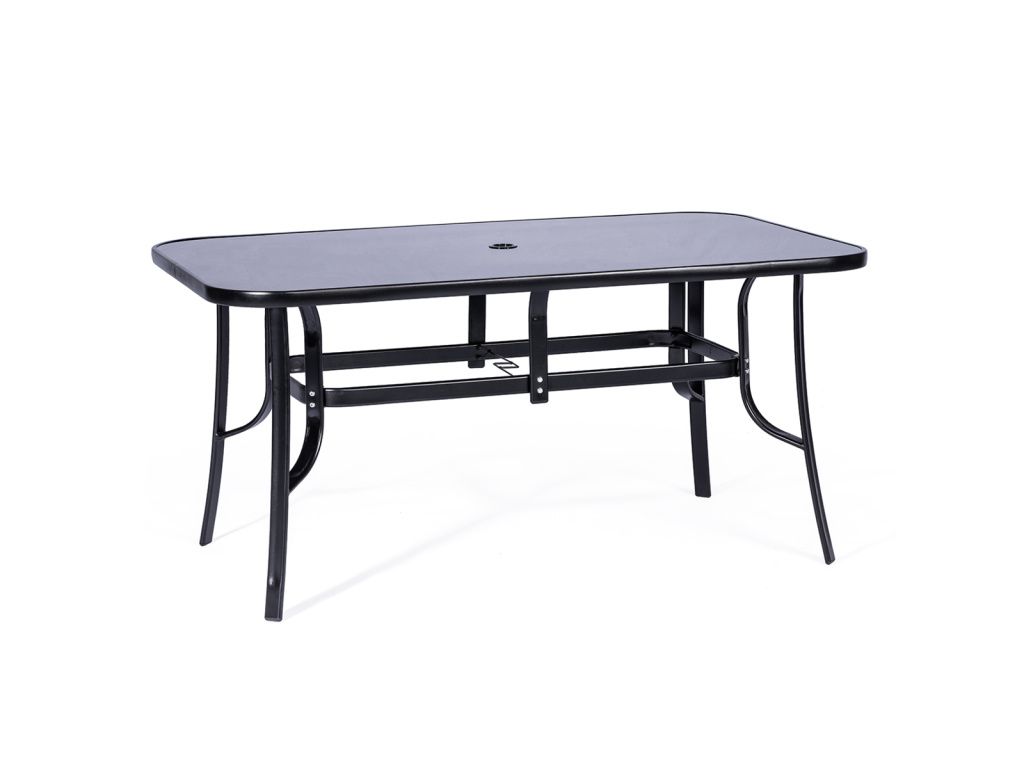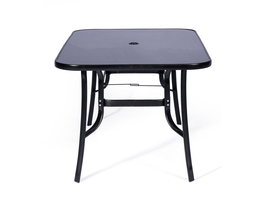 Zahradní stůl s černou ocelovou konstrukcí, deska ze skla s černým podnátěrem, otvor na slunečník, 15x90x70 cm.