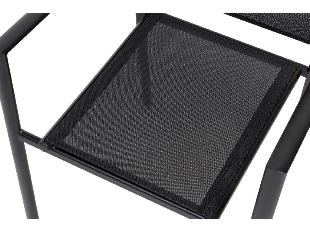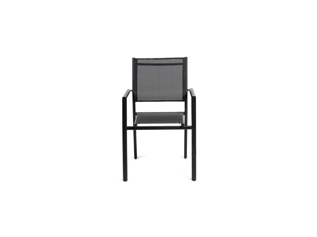 Zahradní hliníková židle s područkami, pevná kovová konstrukce v černém provedení. Sedák a opěradlo z prodyšné textilie, vhodné pro venkovní použití s minimální údržbou. Baleno ve stohu po 30 kusech.